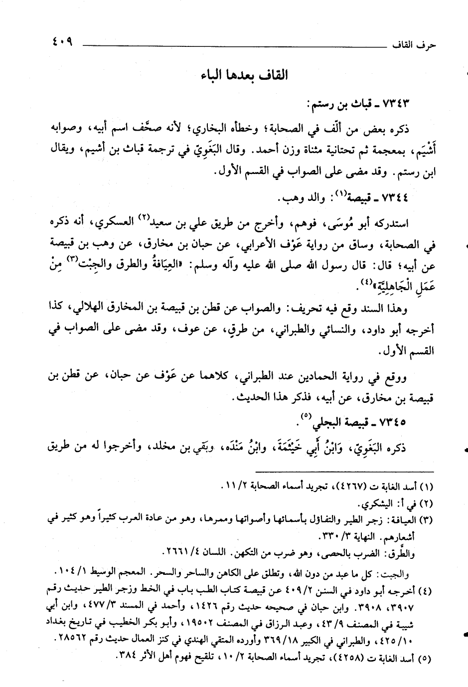 وساق من رواية عوف الأعرابي، عن حبان بن مخارق، عن وهب بن قبيصة عن أبيه، قال: قال رسول اللَّه صلّى اللَّه عليه وآله وسلم: «العيافة والطرق والجبت «٣» من عمل الجاهليّة» «٤» .