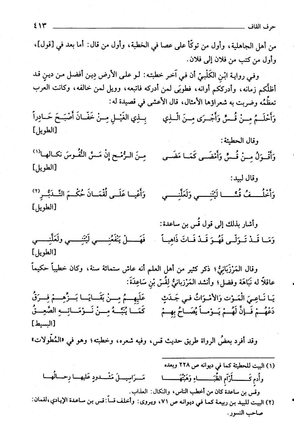 [البسيط] وقد أفرد بعض الرواة طريق حديث قس، وفيه شعره، وخطبته، وهو في «المطوّلات»