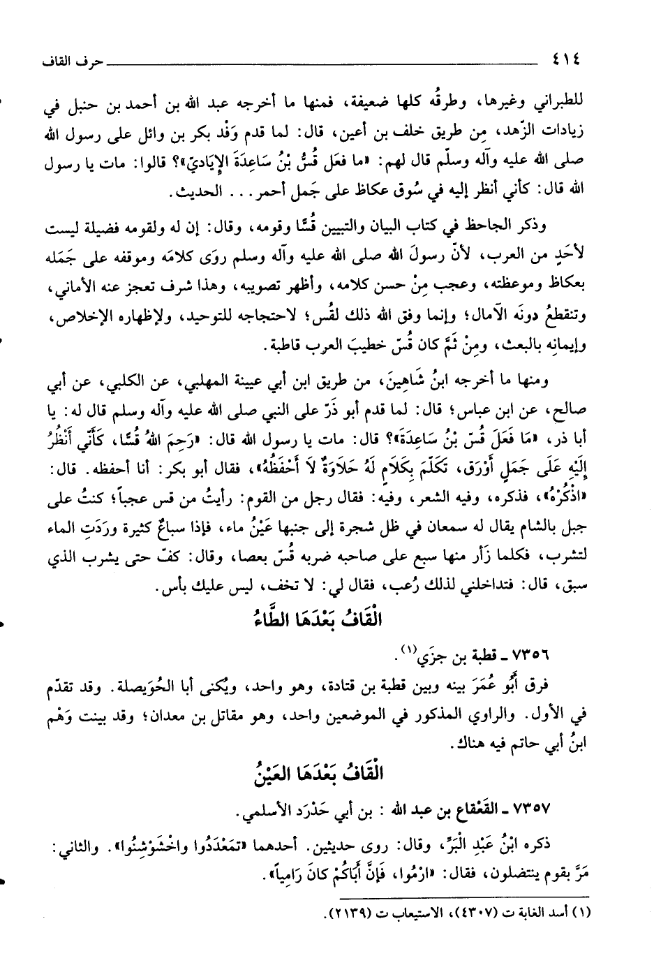 أخرجه عبد اللَّه بن أحمد بن حنبل في زيادات الزّهد، من طريق خلف بن أعين، قال: لما قدم وفد بكر بن وائل على رسول اللَّه صلّى اللَّه عليه وآله وسلم قال لهم: «ما فعل قسّ بن ساعدة الإياديّ» ؟ قالوا: مات يا رسول اللَّه قال: كأني انظر إليه في سوق عكاظ على جمل أحمر ... الحديث.