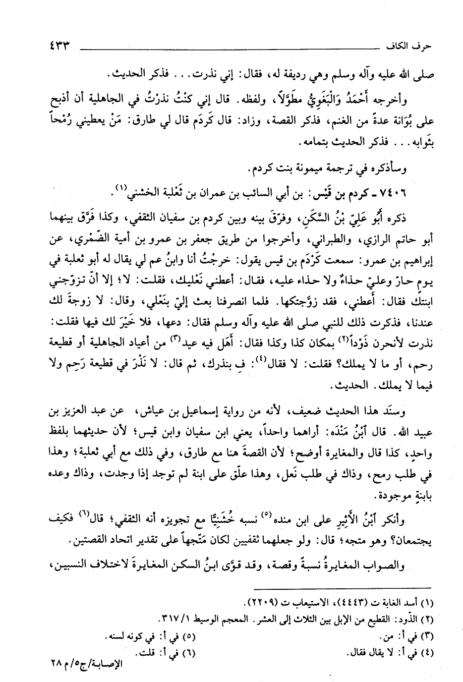وأخرجوا من طريق جعفر بن عمرو بن أمية الضّمري، عن إبراهيم بن عمرو: سمعت كردم بن قيس يقول: خرجت أنا وابن عم لي يقال له أبو ثعلبة في يوم حارّ وعليّ حذاء ولا حذاء عليه، فقال: أعطني نعليك، فقلت: لا، إلا أنّ تزوّجني ابنتك فقال: أعطني، فقد زوّجتكها. فلما انصرفنا بعث إليّ بنعلي، وقال: لا زوجة لك عندنا، فذكرت ذلك للنّبيّ صلّى اللَّه عليه وآله وسلم فقال: دعها، فلا خير لك فيها فقلت:
