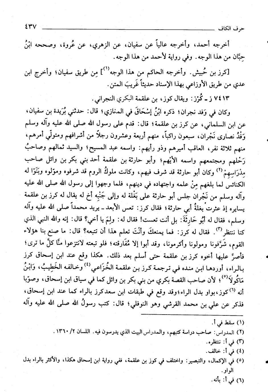 وكان في وفد نجران، ذكره ابن إسحاق في المنازي، قال: حدثني بريدة بن سفيان، عن ابن السلماني، عن كرز بن علقمة، قال: قدم على رسول اللَّه صلّى اللَّه عليه وآله وسلم وفد نصارى نجران، سبعون راكبا، منهم أربعة وعشرون رجلا من أشرافهم ومتولّي أمرهم، منهم ثلاثة نفر، العاقب أميرهم وذو رأيهم: واسمه عبد المسيح، والسيد ثمالهم وصاحب رحلهم ومجتمعهم واسمه الأيهم، وأبو حارثة بن علقمة أحد بني بكر بن وائل صاحب مدارسهم «٢» وكان أبو حارثة قد شرف فيهم، وكانت ملوك الروم قد شرفوه وموّلوه وبنوا له الكنائس لما بلغهم من علمه واجتهاده في دينهم، فلما وجهوا إلى رسول اللَّه صلّى اللَّه عليه وآله وسلم من نجران جلس أبو حارثة على بغلة له وإلى جنبه أخ له يقال له كرز بن علقمة يسايره إذ عثرت بغلة أبي حارثة، فقال كرز: تعس الأبعد- يريد محمدا صلّى اللَّه عليه وآله وسلم، فقال له أبو حارثة: بل أنت تعست! فقال له: ولم يا أخي؟ قال: إنه واللَّه النبي الّذي كنا ننتظر «٣» . فقال له كرز: فما يمنعك وأنت تعلم هذا أن تتبعه؟ قال: ما صنع بنا هؤلاء القوم، شرّفونا ومولونا وأكرمونا، وقد أبوا إلا مفارقته، فلو تبعته لانتزعوا منّا كلّ ما ترى، فأصرّ عليها أخوه كرز بن علقمة حتى أسلم بعد ذلك. هكذا وقع عند ابن إسحاق كرز بالراء، أوردها ابن مندة في ترجمة كرز بن علقمة الخزاعي «٤» وخالفه الخطيب، وابن ماكولا «٥» ، لأن صاحب القصة بكري من بني بكر بن وائل كما في سياق ابن إسحاق، وصوّبا أنه «٦» كوز، بواو بدل الراء، وقد وقع في طبقات ابن سعد كرز بالراء كما عند ابن إسحاق، فذكر عن علي بن محمد القرشي وهو النوفلي، قال: كتب رسول اللَّه صلّى اللَّه عليه وآله