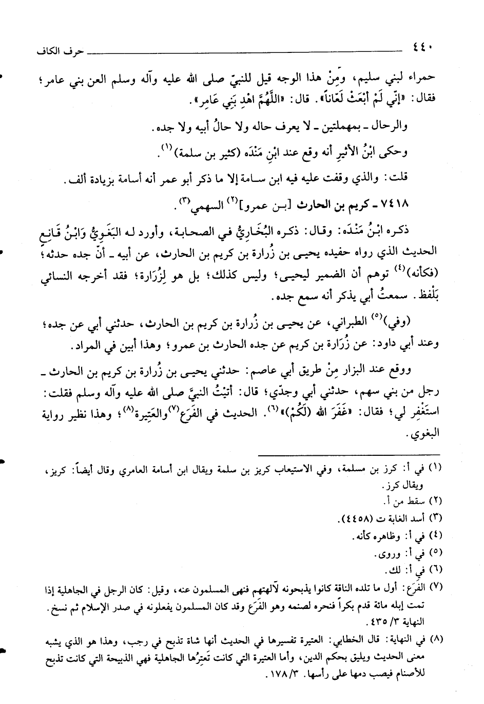 (وفي) «٥» الطبراني، عن يحيى بن زرارة بن كريم بن الحارث، حدثني أبي عن جده، وعند أبي داود: عن زرارة بن كريم عن جده الحارث بن عمرو، وهذا أبين في المراد.
