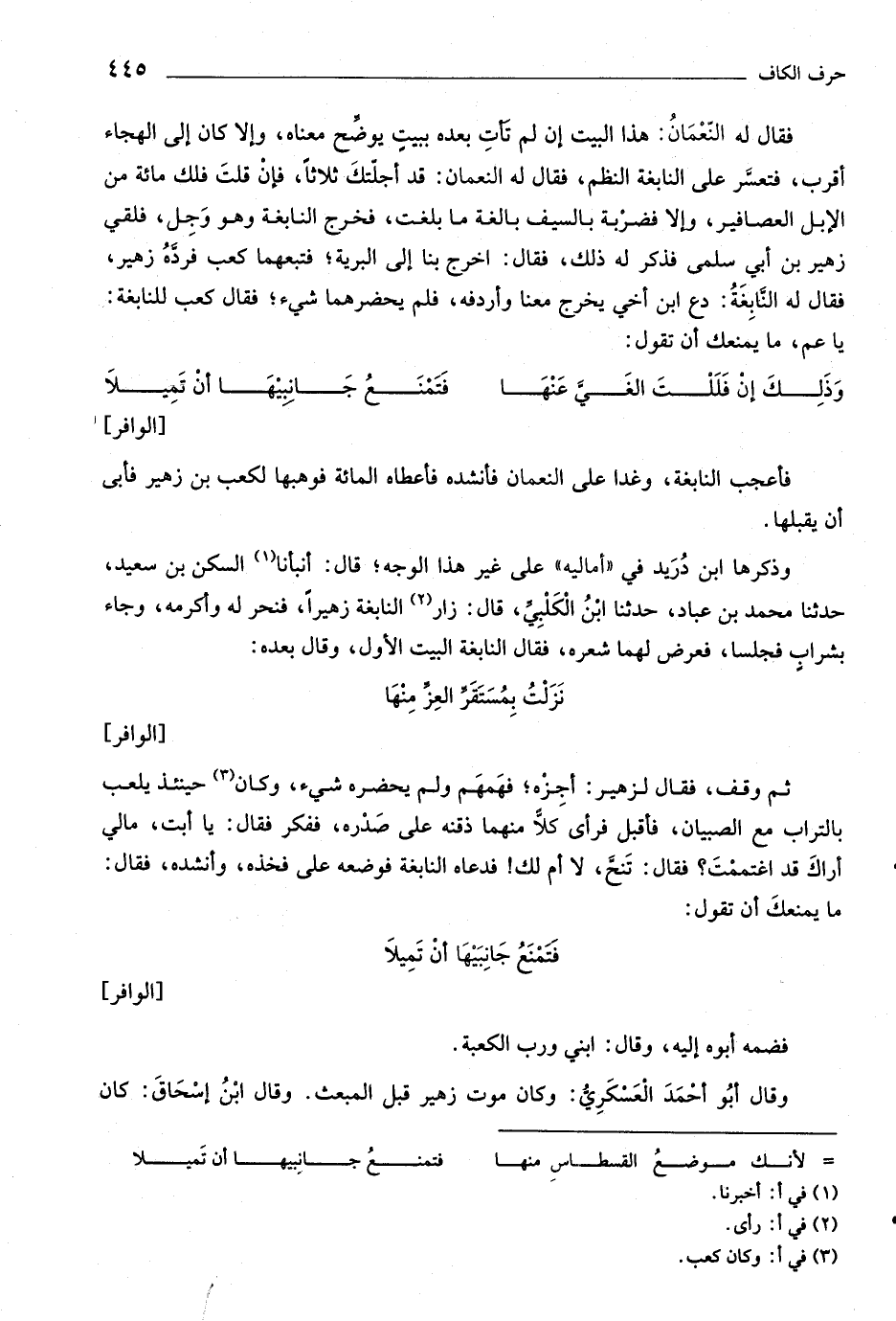 فقال له النعمان: هذا البيت إن لم تأت بعده ببيت يوضّح معناه، وإلا كان إلى الهجاء أقرب، فتعسّر على النابغة النظم، فقال له النعمان: قد أجلّتك ثلاثا، فإن قلت فلك مائة من الإبل العصافير، وإلا فضربة بالسيف بالغة ما بلغت، فخرج النابغة وهو وجل، فلقي زهير بن أبي سلمى فذكر له ذلك، فقال: اخرج بنا إلى البرية، فتبعهما كعب فردّه زهير، فقال له النّابغة: دع ابن أخي يخرج معنا وأردفه، فلم يحضرهما شيء، فقال كعب للنابغة: