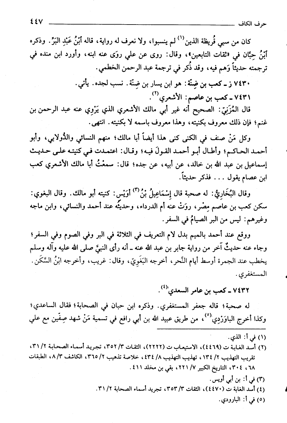 وكل من صنف في الكنى كنى هذا أيضا أبا مالك، منهم النسائي والدّولابي، وأبو أحمد الحاكم، وأطال أبو أحمد القول فيه، وقال: اعتمدت في كنيته على حديث إسماعيل بن عبد اللَّه بن خالد، عن أبيه، عن جده، قال: سمعت أبا مالك الأشعري كعب ابن عصام يقول ... فذكر حديثا.