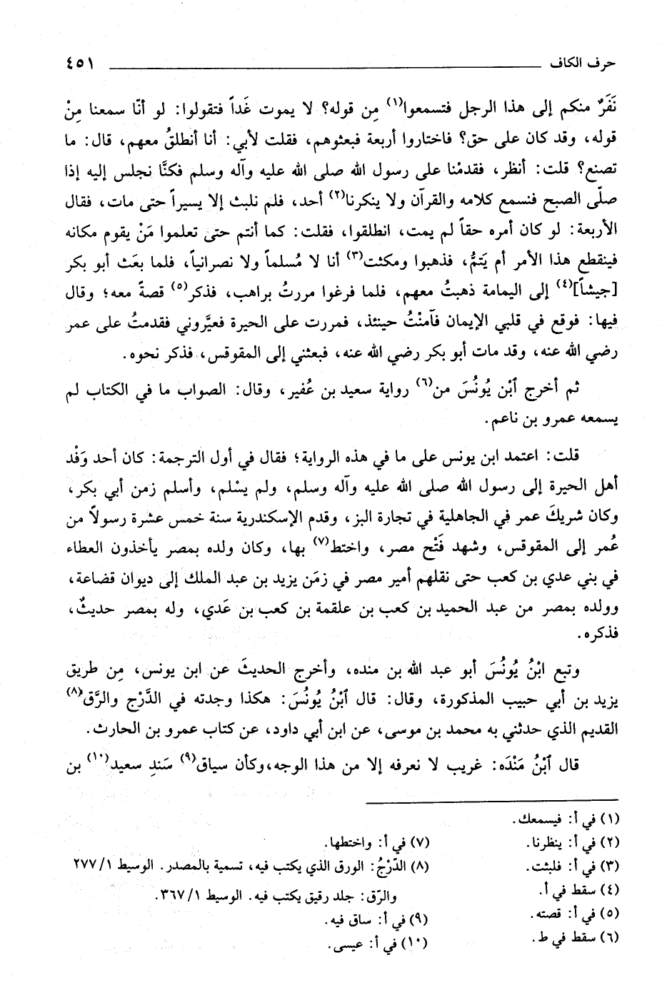 وتبع ابن يونس أبو عبد اللَّه بن مندة، وأخرج الحديث عن ابن يونس، من طريق يزيد بن أبي حبيب المذكورة، وقال: قال ابن يونس: هكذا وجدته في الدّرج والرّقّ «٨» القديم الّذي حدثني به محمد بن موسى، عن ابن أبي داود، عن كتاب عمرو بن الحارث.