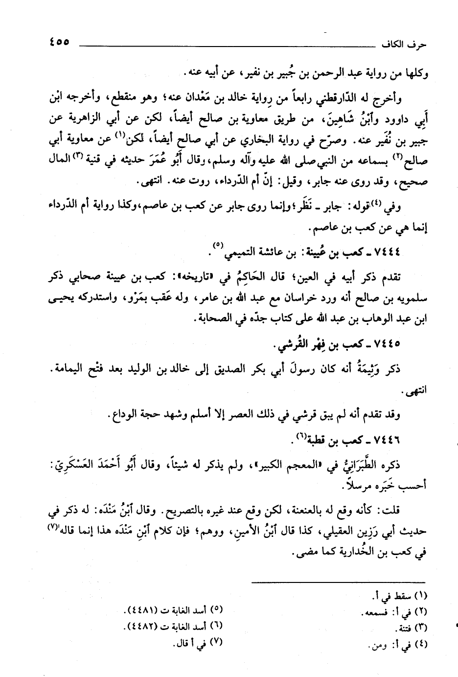 وفي «٤» قوله: جابر- نظر، وإنما روى جابر عن كعب بن عاصم، وكذا رواية أم الدّرداء إنما هي عن كعب بن عاصم.