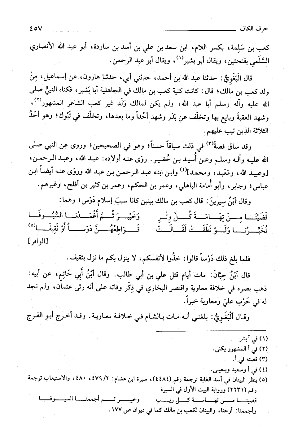(٥) ينظر البيتان في أسد الغابة ترجمة رقم (٤٤٨٤) ، سيرة ابن هشام: ٢/ ٤٧٩، ٤٨٠، والاستيعاب ترجمة رقم (٢٢٣١) ورواية البيت الأول في السيرة