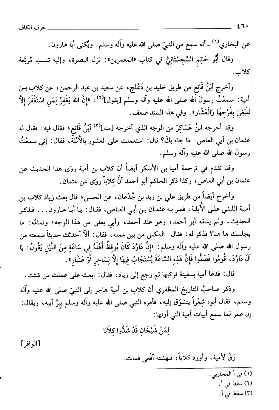 وقد تقدم في ترجمة أمية بن الأسكر أيضا أن كلاب بن أمية روى هذا الحديث عن عثمان بن أبي العاص، وكذا ذكر الحاكم أبو أحمد أنّ كلابا روى عن عثمان.