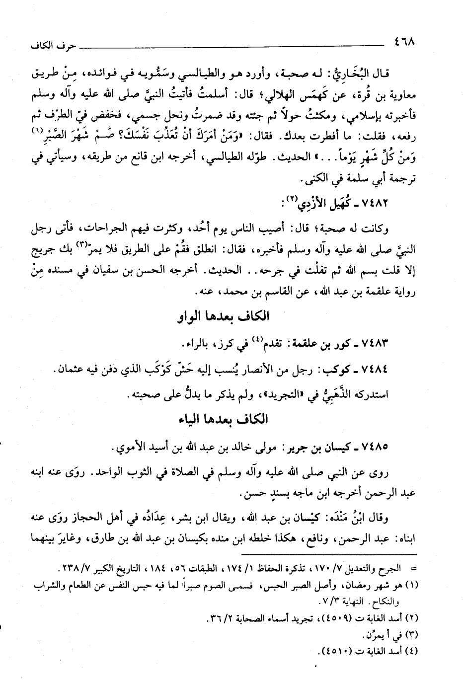 وأورد هو والطيالسي وسمّويه في فوائده، من طريق معاوية بن قرة، عن كهمس الهلالي، قال: أسلمت فأتيت النبيّ صلّى اللَّه عليه وآله وسلم فأخبرته بإسلامي، ومكثت حولا ثم جئته وقد ضمرت ونحل جسمي، فخفض فيّ الطرف ثم رفعه، فقلت: ما أفطرت بعدك. فقال: «ومن أمرك أن تعذّب نفسك؟ صم شهر الصّبر «١» ومن كلّ شهر يوما ... » الحديث.