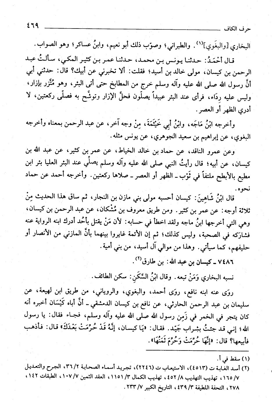 قال ابن شاهين: كيسان أحسبه مولى بني مازن بن النجار، ثم ساق هذا الحديث من ثلاثة أوجه: عن عمر بن كثير. ومن طريق معروف بن مشكان، عن عبد الرحمن بن كيسان، وهي التي أخرجها ابن ماجة ولقد اخطأ في حسابه: لأن من يقتل بأحد أدرك ابنه الرواية عنه فشاركه في الصحبة، وليس كذلك، ثم إن الأئمة غايروا بينهما بأنّ المازني من الأنصار أو حليفهم، كما سيأتي. وهذا من موالي آل أسيد، من بني أمية.