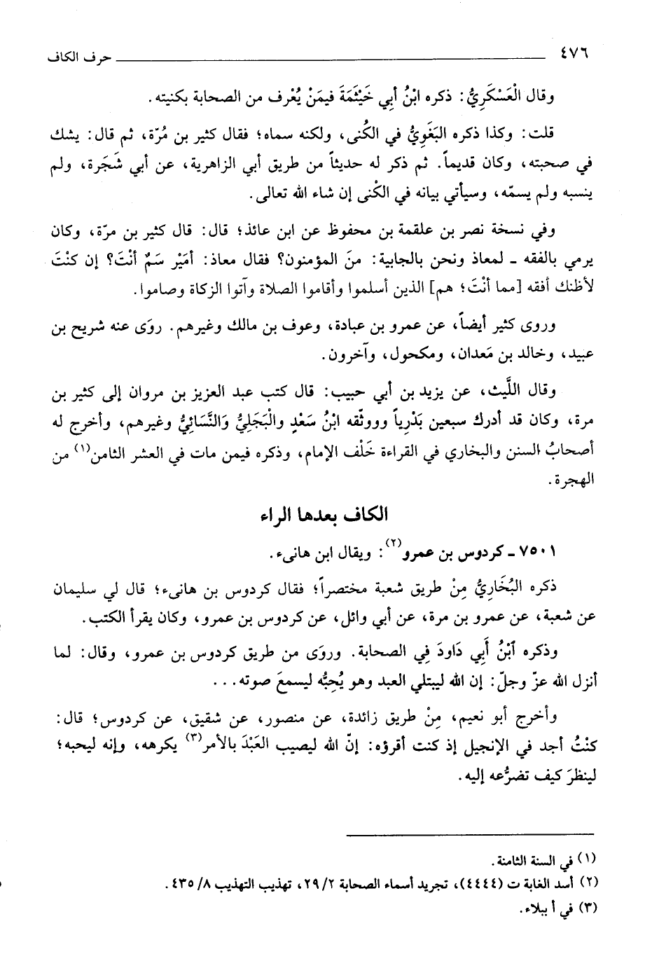 ذكره البخاريّ من طريق شعبة مختصرا، فقال كردوس بن هانئ، قال لي سليمان عن شعبة، عن عمرو بن مرة، عن أبي وائل، عن كردوس بن عمرو، وكان يقرأ الكتب.