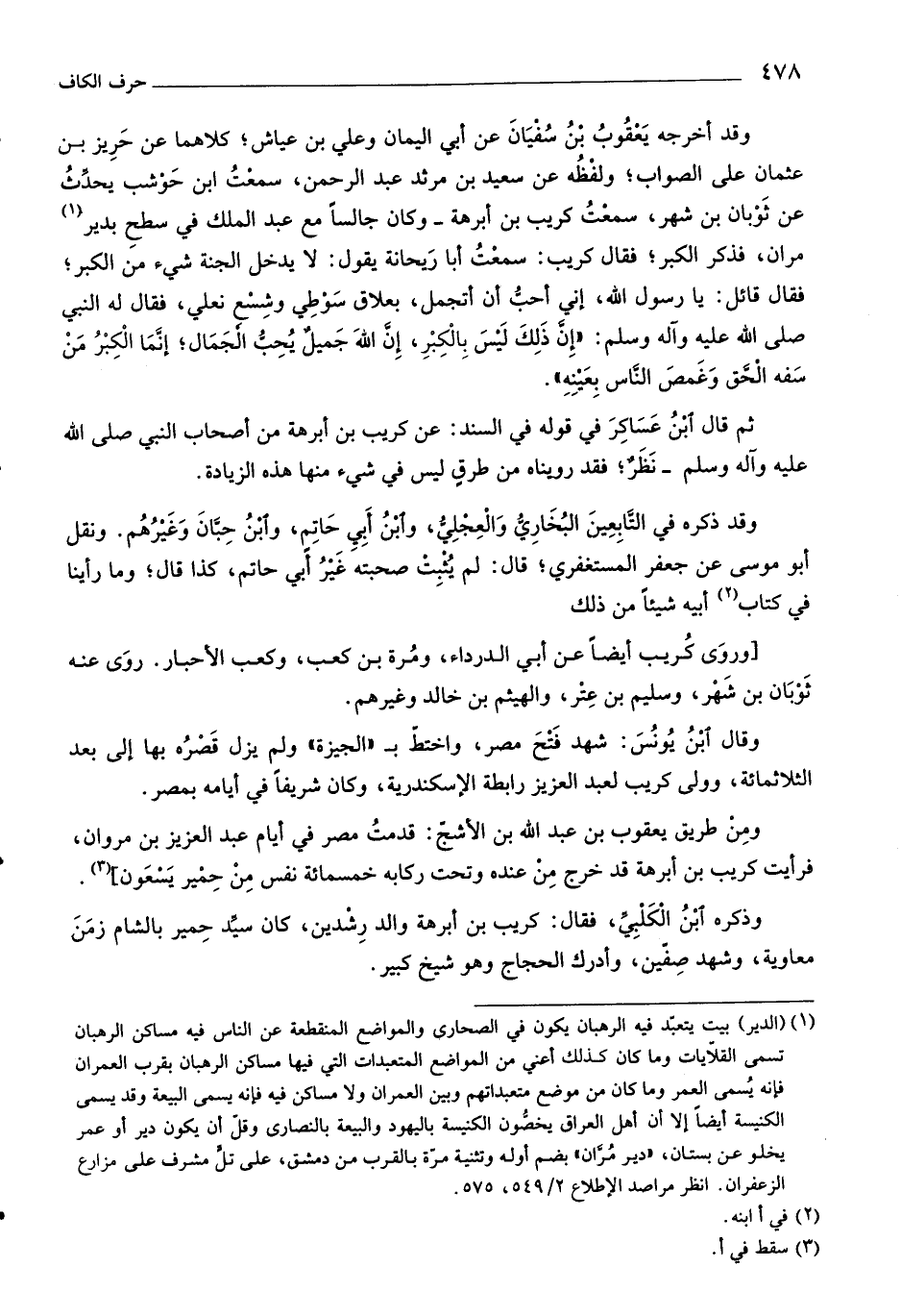 وقد أخرجه يعقوب بن سفيان عن أبي اليمان وعلي بن عياش، كلاهما عن حريز بن عثمان على الصواب، ولفظه عن سعيد بن مرثد عبد الرحمن، سمعت ابن حوشب يحدّث عن ثوبان بن شهر، سمعت كريب بن أبرهة- وكان جالسا مع عبد الملك في سطح بدير «١» مران، فذكر الكبر، فقال كريب: سمعت أبا ريحانة يقول: لا يدخل الجنة شيء من الكبر، فقال قائل: يا رسول اللَّه، إني أحبّ أن أتجمل، بعلاق سوطي وشسع نعلي، فقال له النبي صلّى اللَّه عليه وآله وسلم: «إنّ ذلك ليس بالكبر، إنّ اللَّه جميل يحبّ الجمال، إنّما الكبر من سفه الحقّ وغمص النّاس بعينه» .