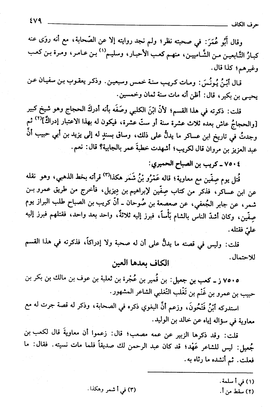 قلت: ذكرته في هذا القسم، لأنّ ابن الكلبي وصفه بأنه أدرك الحجاج وهو شيخ كبير [والحجاج عاش بعده ثلاث عشرة سنة أو ستّ عشرة، فيكون له بهذا الاعتبار إدراك] «٢» ثم وجدت في تاريخ ابن عساكر ما يدلّ على ذلك، وساق بسند له إلى يزيد بن أبي حبيب أنّ عبد العزيز بن مروان قال لكريب، أشهدت خطبة عمر بالجابية؟ قال: نعم.
