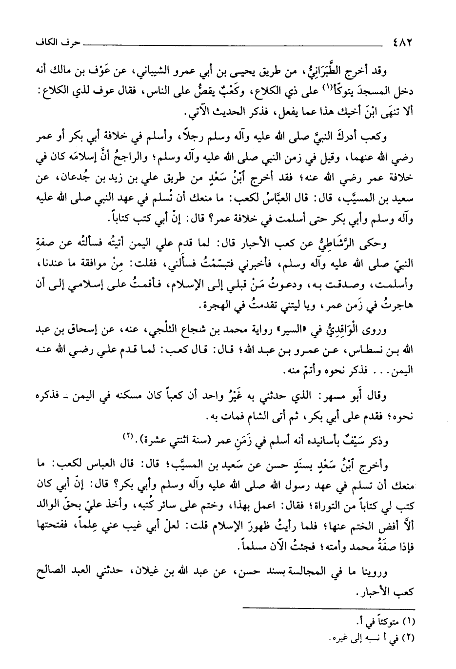 وقد أخرج الطّبرانيّ، من طريق يحيى بن أبي عمرو الشيبانيّ، عن عوف بن مالك أنه دخل المسجد يتوكّأ «١» على ذي الكلاع، وكعب يقصّ على الناس، فقال عوف لذي الكلاع: