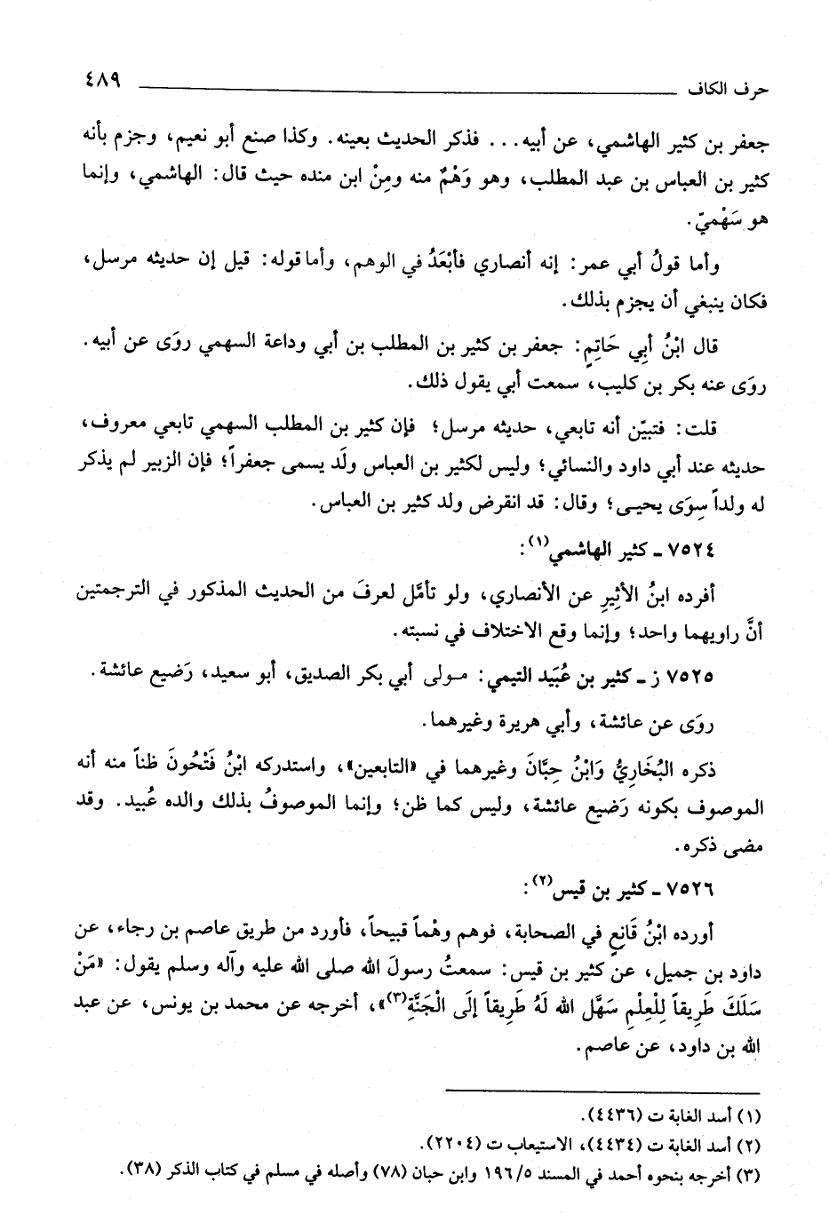 جعفر بن كثير الهاشمي، عن أبيه ... فذكر الحديث بعينه. وكذا صنع أبو نعيم، وجزم بأنه كثير بن العباس بن عبد المطلب، وهو وهم منه ومن ابن مندة حيث قال: الهاشمي، وإنما هو سهميّ.