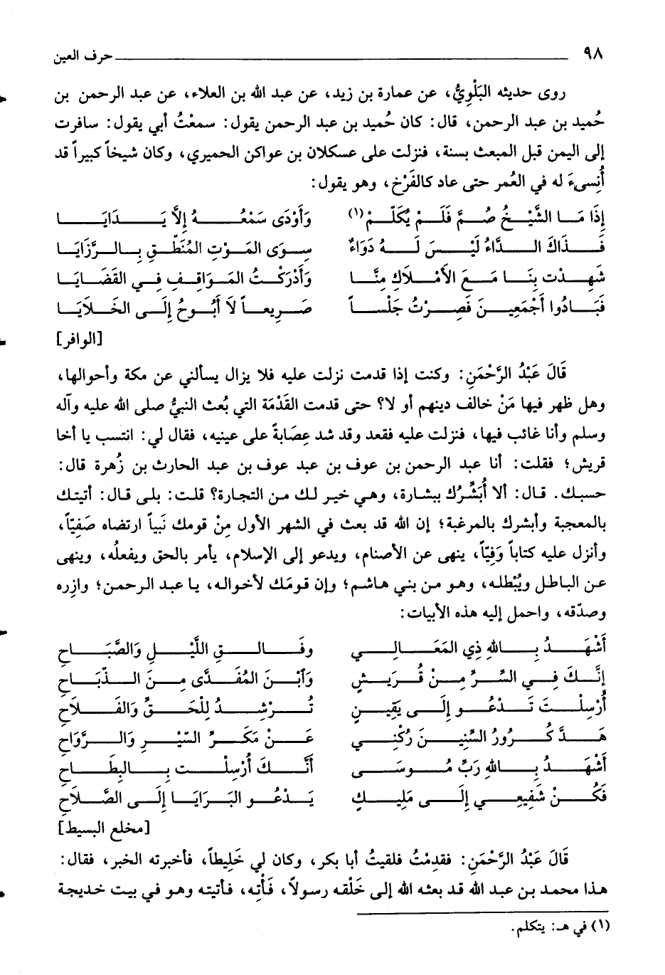 [الوافر] قال عبد الرّحمن: وكنت إذا قدمت نزلت عليه فلا يزال يسألني عن مكة وأحوالها، وهل ظهر فيها من خالف دينهم أو لا؟ حتى قدمت القدمة التي بعث النبيّ صلّى اللَّه عليه وآله وسلّم وأنا غائب فيها، فنزلت عليه فقعد وقد شد عصابة على عينيه، فقال لي: انتسب يا أخا قريش، فقلت: أنا عبد الرحمن بن عوف بن عبد عوف بن عبد الحارث بن زهرة قال: