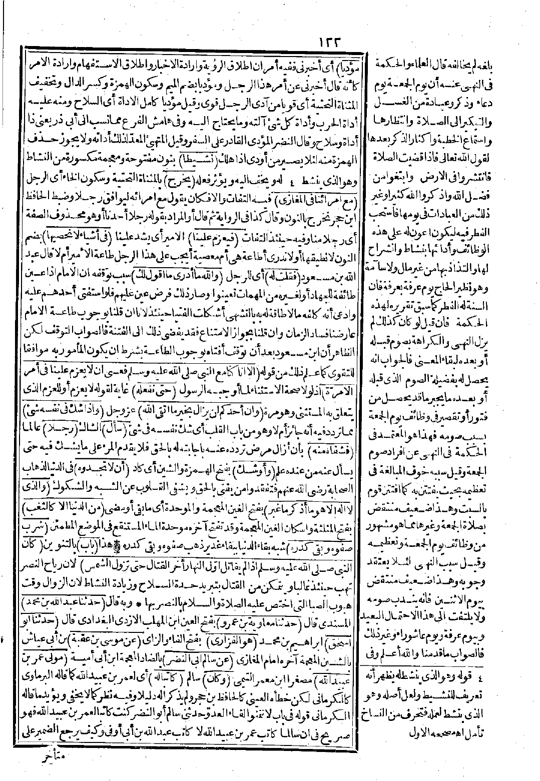 مؤديًا) أي أخبرني ففيه أمران إطلاق الرؤية وإرادة الإخبار وإطلاق الاستفهام وإرادة الأمر كأنه قال: أخبرني عن أمر هذا الرجل ومؤديًا بضم الميم وسكون الهمزة وكسر الدال المثناة التحتية أي قويًا من آدى الرجل قوي، وقيل: مؤديًا كامل الأداة أي السلاح، ومنه: عليه أداة الحرب وأداة كل شيء آلته وما يحتاج إليه. وفي هامش الفرع مما نسب إلى أبي يعني ذا أداة وسلاح، وقال النضر المؤدي القادر على السفر، وقيل المتهيئ المعدّ لذلك أداته ولا يجوز حذف الهمزة منه لئلا يصير من أودى إذا هلك (نشيطًا) بنون مفتوحة ومعجمة مكسورة من النشاط وهو الذي ينشط له ويخف إليه ويؤثر فعله (يخرج) بالمثناة التحتية وسكون الخاء أي الرجل (مع أمرائنا في المغازي) فيه التفات وإلاّ فكان يقول مع أمرائه ليوافق رجلاً، وضبط الحافظ ابن حجر نخرج بالنون وقال كذا في الرواية ثم قال: أو المراد بقوله رجلاً أحدنا أو هو محذوف الصفة أي رجلاً منا وفيه حينئذ التفات (فيعزم علينا) الأمير أي يشد علينا (في أشياء لا نحصيها) بضم النون لا نطيقها أو لا ندري أطاعة هي أم معصية أيجب على هذا الرجل طاعة الأمير أم لا. قال عبد الله بن مسعود (فقلت له): أي للرجل (والله ما أدري ما أقول لك) سبب توقفه أن الإمام إذا عين طائفة للجهاد أو لغيره من المهمات تعينوا وصار ذلك فرض عين عليهم، فلو استفتى أحدهم عليه وادّعى أنه كلفه ما لا طاقة له به بالتشهي أشكلت الفتيا حينئذ لأنّا إن قلنا بوجوب طاعة الإمام عارضنا فساد الزمان، وإن قلنا بجواز الامتناع فقد يفضي ذلك إلى الفتنة فالصواب التوقف، لكن الظاهر أن ابن مسعود بعد أن توقف أفتاه بوجوب الطاعة بشرط أن يكون المأمور به موافقًا للتقوى كما علم ذلك من قوله (إلا أنّا كنا مع النبي -صَلَّى اللَّهُ عَلَيْهِ وَسَلَّمَ- فعسى أن لا يعزم علينا في أمر إلا مرة) إذ لولا صحة الاستثناء لما أوجبه الرسول (حتى نفعله) غاية لقوله أو للعزم الذي يتعلق به المستثنى وهو مرة (وإن أحدكم لن يزال بخير ما اتقى الله) عز وجل (وإذا شك في نفسه شيء) مما تردد فيه أنه جائز أم لا وهو من باب القلب أي شك نفسه في شيء (سأل) الشاكّ (رجلاً) عالمًا (فشفاه منه) بأن أزال مرض تردده عنه بإجابته له بالحق فلا يقدم