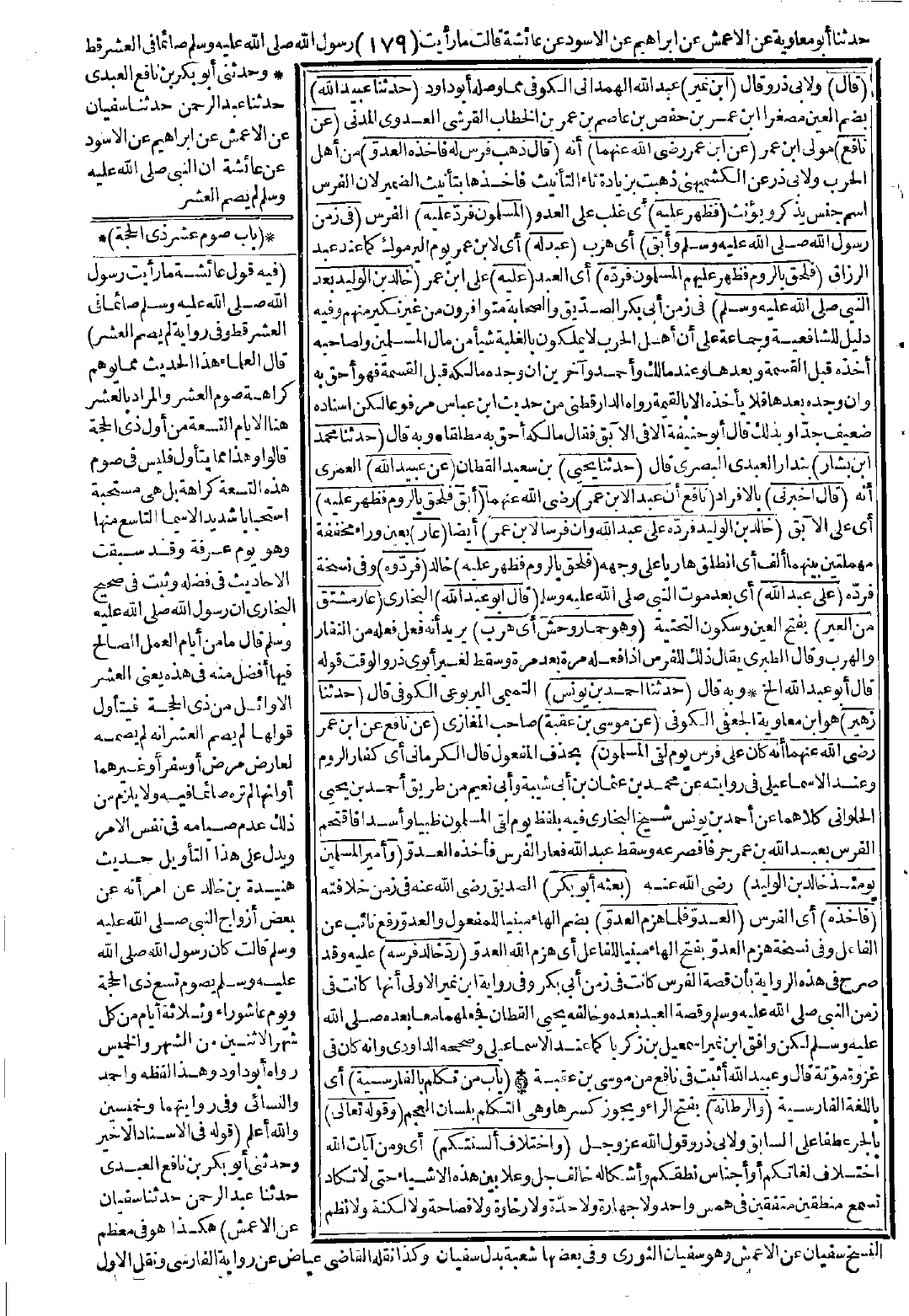 وبه قال: (حدّثنا أحمد بن يونس) التميمي اليربوعي الكوفي قال: (حدّثنا زهير) هو ابن معاوية الجعفي الكوفي (عن موسى بن عقبة) صاحب المغازي (عن نافع عن ابن عمر -رضي الله عنهما- أنه كان على فرس يوم لقي المسلمون) بحذف المفعول. قال الكرماني: أي كفار الروم، وعند الإسماعيلي في روايته عن محمد بن عثمان بن أبي شيبة وأبي نعيم من طريق أحمد بن يحيشى الحلواني كلاهما عن أحمد بن يونس شيخ البخاري فيه بلفظ يوم لقي المسلمون ظبيًا وأسدًا فاقتحم الفرس بعبد الله بن عمر جرفًا فصرعه وسقط عبد الله فعار الفرس فأخذه العدوّ، (وأمير المسلمين يومئذٍ خالد بن الوليد) -رضي الله عنه- (بعثه أبو بكر) الصديق -رضي الله عنه- في زمن خلافته (فأخذه) أي الفرس (العدوّ فلما هزم العدوّ) بضم الهاء مبنيًّا للمفعول والعدوّ رفع نائب عن الفاعل، وفي نسخة: هزم العدوّ بفتح الهاء مبنيًّا للفاعل أي هزم الله العدو (ردّ خالد فرسه) عليه. وقد صرّح في هذه الرواية بأن قصة الفرس كانت في زمن أبي بكر، وفي رواية ابن نمير الأولى أنها كانت في زمن النبي -صَلَّى اللَّهُ عَلَيْهِ وَسَلَّمَ-، وقصة العبد بعده، وخالفه يحيى القطان فجعلهما معًا بعده -صَلَّى اللَّهُ عَلَيْهِ وَسَلَّمَ-، لكن وافق ابن نمير إسماعيل بن زكريا كما عند الإسماعيلي وصححه الداودي وأنه كان في غزوة مؤتة. قال: وعبيد الله أثبت في نافع من موسى بن عقبة.