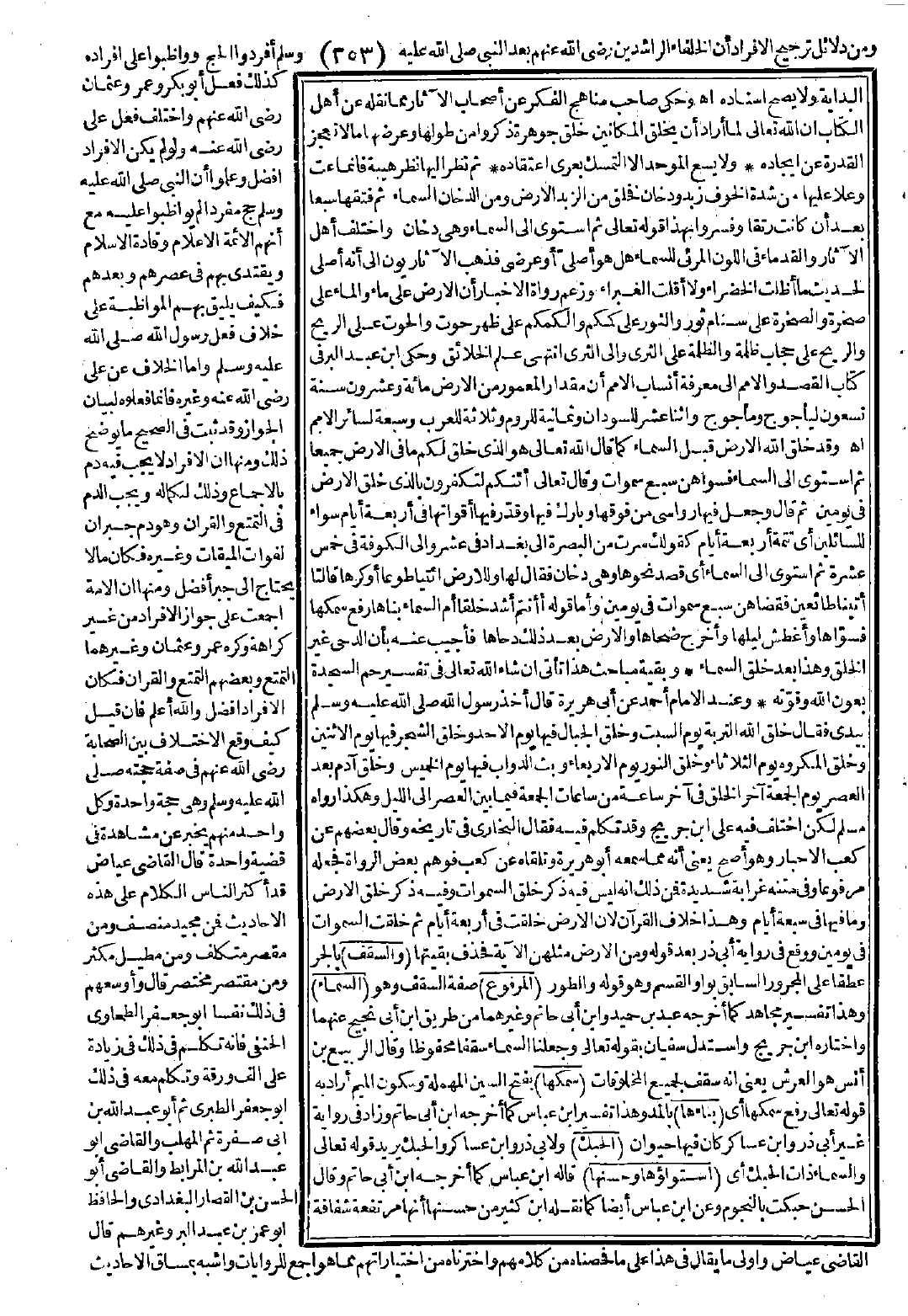 وقد خلق الله الأرض قبل السماء كما قال تعالى: {هو الذي خلق لكم ما في الأرض جميعًا ثم استوى إلى السماء فسواهن سبع سماوات} [البقرة: 29]. وقال تعالى: {أئنكم لتكفرون بالذي خلق الأرض في يومين} [فصلت: 9، 10]. ثم قال: {وجعل فيها رواسي من فوقها وبارك فيها وقدّر فيها أقواتها في أربعة أيام سواء للسائلين} أي تتمة أربعة أيام كقولك: سرت من البصرة إلى بغداد في عشر، وإلى الكوفة في خمس عشرة، ثم استوى إلى السماء أي قصد نحوها وهي دخان فقال لها وللأرض: {ائتيا طوعًا أو كرهًا قالتا أتينا طائعين فقضاهن سبع سماوات في يومين} [فصلت: 11، 12]. وأما قوله: ({أنتم أشدّ خلقًا أم السماء بناها رفع سمكها فسواها وأغطش ليلها وأخرج ضحاها والأرض بعد ذلك دحاها} [النازعات: 27 - 30]. فأجيب عنه بأن الدحي غير الخلق وهذا بعد خلق السماء.