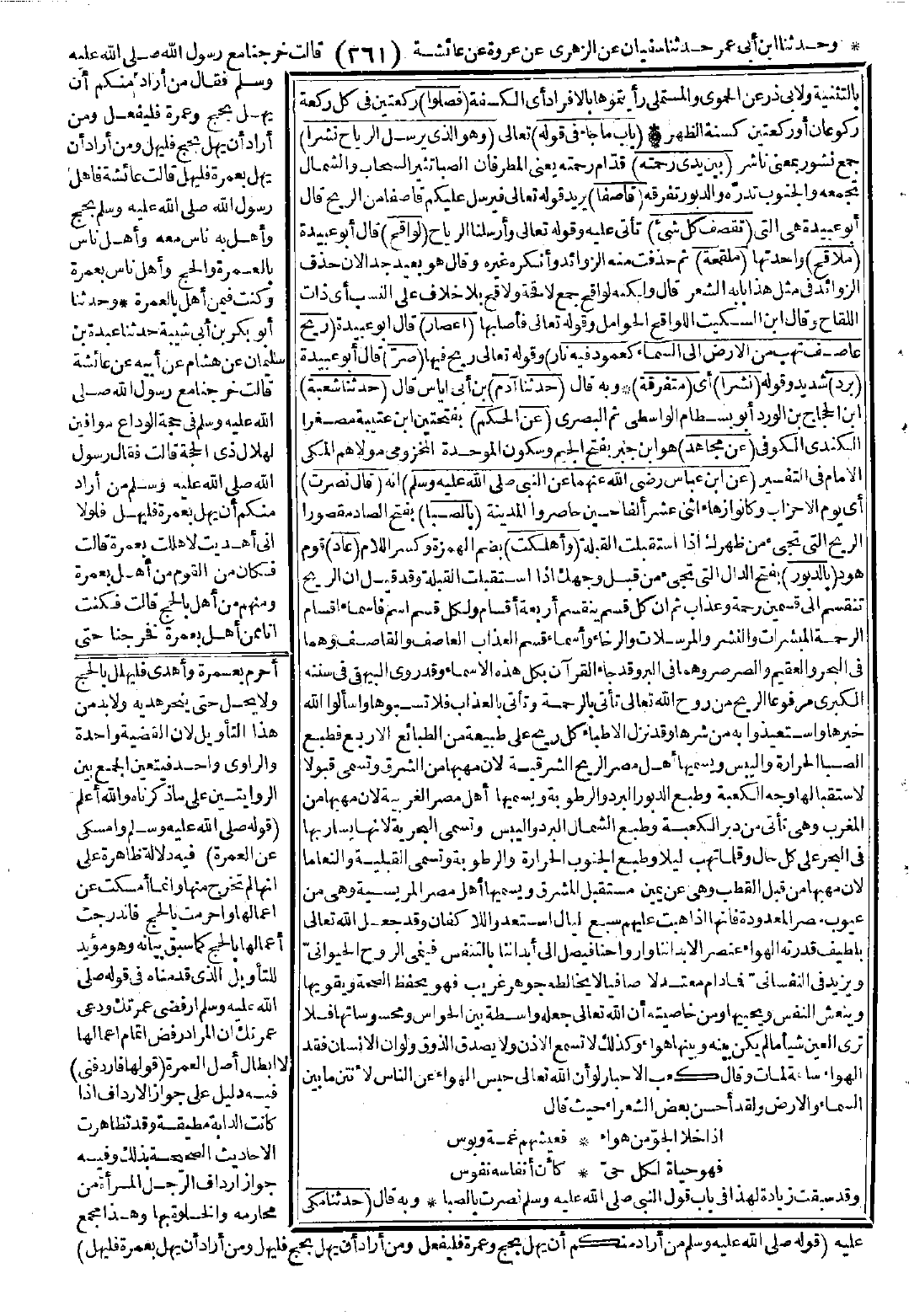 (نصرت) أي يوم الأحزاب وكانوا زهاء اثني عشر ألفًا حين حاصروا المدينة (بالصبا)، بفتح الصاد مقصورًا الريح التي تجيء من ظهرك إذا استقبلت القبلة (وأهلكت) بضم الهمزة وكسر اللام (عاد) قوم هود (بالدبور). بفتح الدال التي تجيء من قبل وجهك إذا استقبلت القبلة، وقد قيل: إن الريح تنقسم إلى قسمين: رحمة وعذاب ثم إن كل قسم ينقسم أربعة أقسام، ولكل قسم اسم فأسماء أقسام الرحمة: المبشراث والنشر والمرسلات والرخاء. وأسماء قسم العذاب: العاصف والقاصف وهما في البحر، والعقيم والصرصر وهما في البر، وقد جاء القرآن بكل هذه الأسماء. وقد روى البيهقي في سننه الكبرى مرفوعًا: الريح من روح الله تعالى تأتي بالرحمة وتأتي بالعذاب فلا تسبوها واسألوا الله خيرها واستعيذوا به من شرها، وقد نزل الأطباء كل ريح على طبيعة من الطبائع الأربع: فطبع الصبا الحرارة واليبس ويسميها أهل مصر الريح الشرقية لأن مهبها من الشرق وتسمى قبولاً لاستقبالها وجه الكعبة، وطبع الدبور البرد والرطوبة ويسميها أهل مصر الغربية لأن مهبها من المغرب وهي تأتي من دبر الكعبة، وطبع الشمال البرد واليبس وتسمى البحرية لأنها يسار بها في البحر على كل حال وقلما تهب ليلاً، وطبع الجنوب الحرارة والرطوبة وتسمى القبلية والنعاما لأن مهبها من قبل القطب وهي عن يمين مستقبل المشرق ويسميها أهل مصر المريسية وهي من عيوب مصر المعدودة، فإنها إذا هبت عليهم سبع ليال استعدوا للأكفان، وقد جعل الله تعالى بلطيف قدرته الهواء عنصرًا لأبداننا وأرواحنا فيصل إلى أبداننا بالتنفس فينمي الروح الحيواني ويزيد في النفساني، فما دام معتدلاً صافيًا لا يخالطه جوهر غريب فهو يحفظ الصحة ويقويها وينعش النفس ويحييها، ومن خاصيته أن الله تعالى جعله واسطة بين الحواس ومحسوساتها فلا ترى العين شيئًا ما لم يكن بينه وبينها هواء وكذلك لا تسمع الأذن ولا يصدق الذوق ولو أن الإنسان فقد الهواء ساعة لمات. وقال كعب الأحبار: لو أن الله تعالى حبس الهواء عن الناس لأنتن ما بين السماء والأرض، ولقد أحسن بعض الشعراء حيث قال: