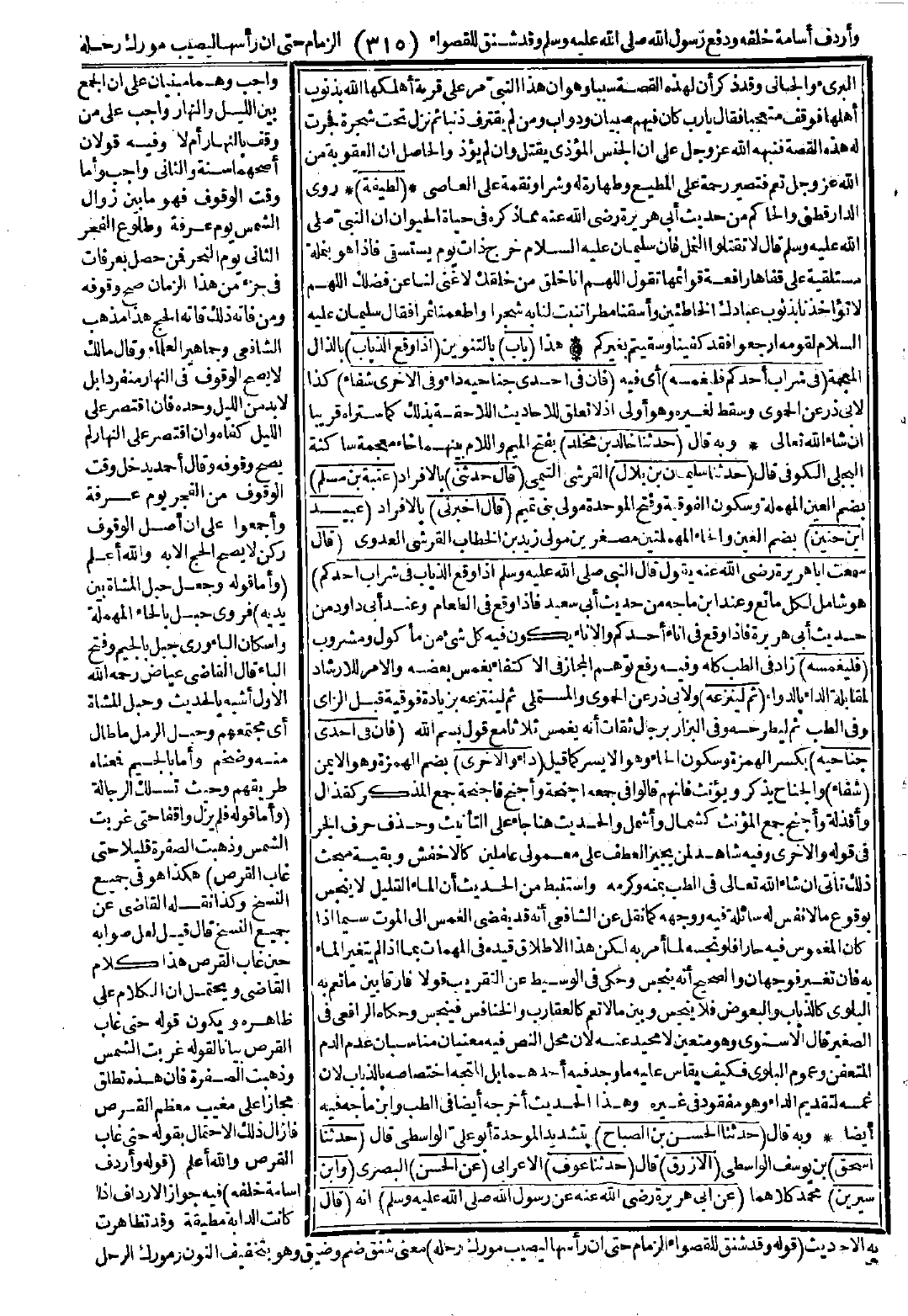 3320 - حَدَّثَنَا خَالِدُ بْنُ مَخْلَدٍ حَدَّثَنَا سُلَيْمَانُ بْنُ بِلاَلٍ قَالَ: حَدَّثَنِي عُتْبَةُ بْنُ مُسْلِمٍ قَالَ: أَخْبَرَنِي عُبَيْدُ بْنُ حُنَيْنٍ قَالَ: سَمِعْتُ أَبَا هُرَيْرَةَ -رضي الله عنه- يَقُولُ: قَالَ النَّبِيُّ -صَلَّى اللَّهُ عَلَيْهِ وَسَلَّمَ-: «إِذَا وَقَعَ الذُّبَابُ فِي شَرَابِ أَحَدِكُمْ فَلْيَغْمِسْهُ ثُمَّ لِيَنْزِعْهُ، فَإِنَّ فِي إِحْدَى جَنَاحَيْهِ دَاءً وَالأُخْرَى شِفَاءً». [الحديث 3320 - طرفه في: 5782].