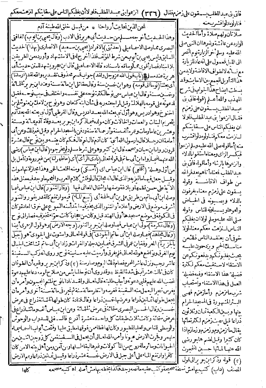 (قال ابن عباس) -رضي الله عنهما- فيما رواه ابن أبي حاتم في قوله تعالى: ({بادي الرأي}) [هود: 27] أي (ما ظهر لنا). من غير روية وتأمل بل من أوّل وهلة. ({أقلعي}) قال ابن عباس أي (أمسكي) ومنه اقلعت الحمى وهذا مجاز لأنها موات، وقيل جعل فيها ما تميز به والذي قال إنه مجاز قال لو فتش كلام العرب والعجم ما وجد فيه مثل هذه الآية على حسن نظمها وبلاغة وصفها واشتمال المعاني فيها ({وفار التنور}) [هود: 40] قال ابن عباس فيما وصله ابن أبي حاتم من طريق علي بن طلحة أي (نبع الماء) فيه وارتفع كالقدر يفور، والتنور أشرف موضع في الأرض وأعلاه أو التنور الذي يخبز فيه ابتدأ منه النبوع على خرق العادة، وكان في الكوفة في موضع مسجدها أو في الهند قيل: وكان من حجارة كانت حوّاء تخبز فيه فصار إلى نوح.