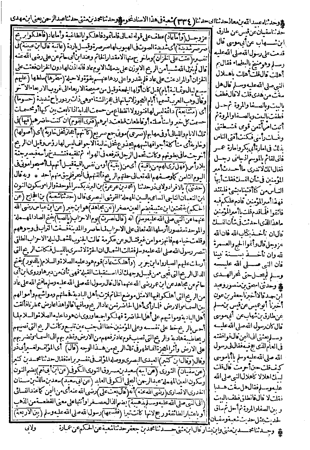 3343 - حَدَّثَنا مُحَمَّدُ بْنُ عَرْعَرَةَ حَدَّثَنَا شُعْبَةُ عَنِ الْحَكَمِ عَنْ مُجَاهِدٍ عَنِ ابْنِ عَبَّاسٍ -رضي الله عنهما- عَنِ النَّبِيِّ -صَلَّى اللَّهُ عَلَيْهِ وَسَلَّمَ- قَالَ: «نُصِرْتُ بِالصَّبَا، وَأُهْلِكَتْ عَادٌ بِالدَّبُورِ».