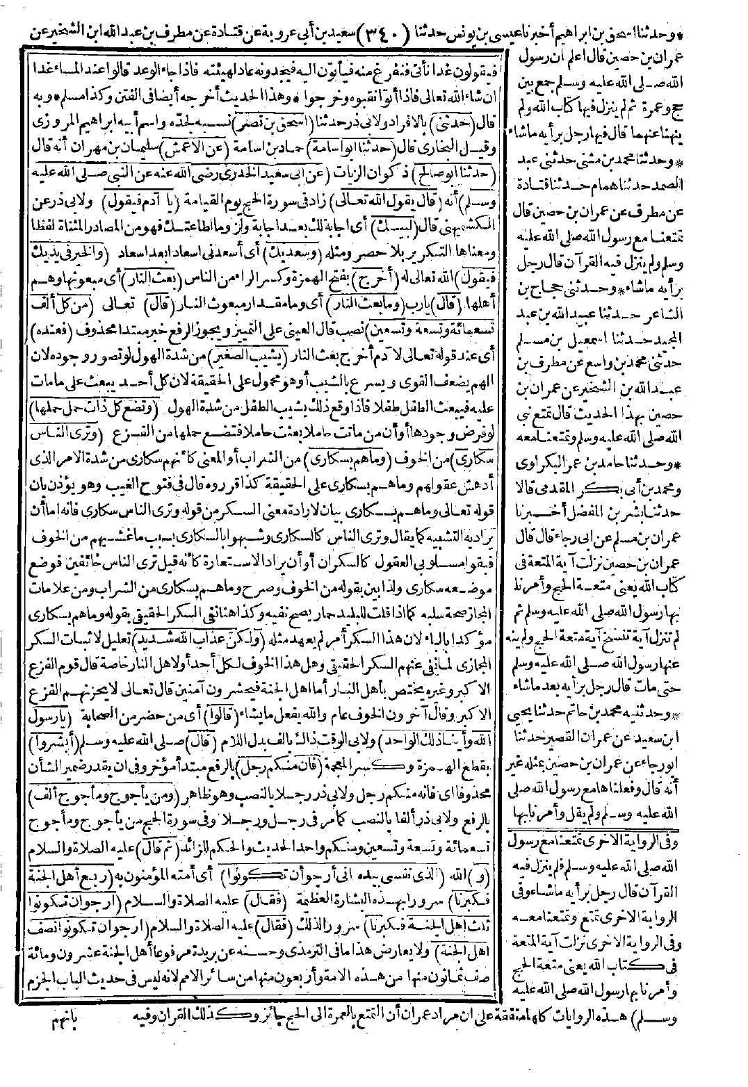 3348 - حَدَّثَنِي إِسْحَاقُ بْنُ نَصْرٍ حَدَّثَنَا أَبُو أُسَامَةَ عَنِ الأَعْمَشِ حَدَّثَنَا أَبُو صَالِحٍ عَنْ أَبِي سَعِيدٍ الْخُدْرِيِّ -رضي الله عنه- عَنِ النَّبِيِّ -صَلَّى اللَّهُ عَلَيْهِ وَسَلَّمَ- قَالَ: «يَقُولُ اللَّهُ تَعَالَى: يَا آدَمُ. فَيَقُولُ: لَبَّيْكَ وَسَعْدَيْكَ، وَالْخَيْرُ فِي يَدَيْكَ. فَيَقُولُ: أَخْرِجْ بَعْثَ النَّارِ. قَالَ: وَمَا بَعْثُ النَّارِ؟ قَالَ: مِنْ كُلِّ أَلْفٍ تِسْعَمِائَةٍ وَتِسْعَةً وَتِسْعِينَ. فَعِنْدَهُ يَشِيبُ الصَّغِيرُ، وَتَضَعُ كُلُّ ذَاتِ حَمْلٍ حَمْلَهَا، وَتَرَى النَّاسَ سُكَارَى وَمَا هُمْ بِسُكَارَى، وَلَكِنَّ عَذَابَ اللَّهِ شَدِيدٌ. قَالُوا: يَا رَسُولَ اللَّهِ، وَأَيُّنَا ذَلِكَ الْوَاحِدُ؟ قَالَ: أَبْشِرُوا فَإِنَّ مِنْكُمْ رَجُلاً وَمِنْ يَأْجُوجَ وَمَأْجُوجَ أَلْفٌ. ثُمَّ قَالَ: وَالَّذِي نَفْسِي بِيَدِهِ إِنِّي أَرْجُو أَنْ تَكُونُوا رُبُعَ أَهْلِ الْجَنَّةِ. فَكَبَّرْنَا فَقَالَ: أَرْجُو أَنْ تَكُونُوا ثُلُثَ أَهْلِ الْجَنَّةِ. فَكَبَّرْنَا. فَقَالَ: أَرْجُو أَنْ تَكُونُوا نِصْفَ أَهْلِ الْجَنَّةِ. فَكَبَّرْنَا فَقَالَ: مَا أَنْتُمْ فِي النَّاسِ إِلاَّ كَالشَّعَرَةِ السَّوْدَاءِ فِي جِلْدِ ثَوْرٍ أَبْيَضَ, أَوْ كَشَعَرَةٍ بَيْضَاءَ فِي جِلْدِ ثَوْرٍ أَسْوَدَ». [الحديث 3348 - أطرافه في: 4741، 6530، 7483].
