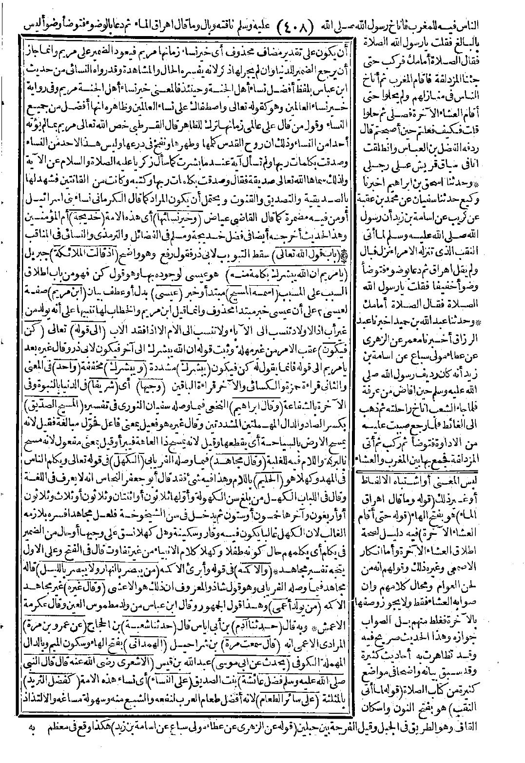 أن يكون على تقدير مضاف محذوف أي خير نساء زمانها مريم فيعود الضمير على مريم، وإنما جاز أن يرجع الضمير للدنيا وإن لم يجر لها ذكر لأنه يفسره الحال والمشاهدة. وقد رواه النسائي من حديث ابن عباس بلفظ: أفضل نساء أهل الجنة، وحينئذٍ فالمعنى خير نساء أهل الجنة مريم، وفي رواية خير نساء العالمين وهو كقوله تعالى: {واصطفاك على نساء العالمين} [آل عمران: 42] وظاهره: أنها أفضل من جميع النساء، وقول من قال على عالمي زمانها ترك للظاهر.