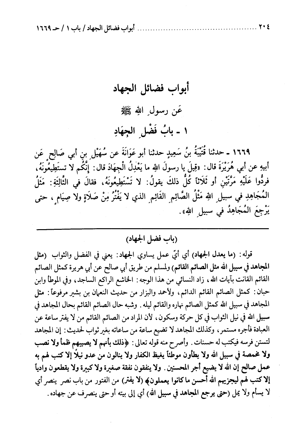 [1619] قَوْلُهُ (مَا يَعْدِلُ الْجِهَادَ) أَيْ أَيُّ عَمَلٍ يُسَاوِي الْجِهَادَ يَعْنِي فِي الْفَضْلِ وَالثَّوَابِ (مَثَلُ الْمُجَاهِدِ فِي سَبِيلِ اللَّهِ مَثَلُ الصَّائِمِ الْقَائِمِ) وَلِمُسْلِمٍ مِنْ طَرِيقِ أَبِي صَالِحٍ عَنْ أَبِي هُرَيْرَةَ كَمَثَلِ الصَّائِمِ الْقَائِمِ الْقَانِتِ بِآيَاتِ اللَّهِ زَادَ النَّسَائِيُّ مِنْ هَذَا الْوَجْهِ الخاشع الراكع الساجد وفي الموطأ وبن حِبَّانَ كَمَثَلِ الصَّائِمِ الْقَائِمِ الدَّائِمِ وَلِأَحْمَدَ وَالْبَزَّارِ مِنْ حَدِيثِ النُّعْمَانِ بْنِ بَشِيرٍ مَرْفُوعًا مَثَلُ الْمُجَاهِدِ فِي سَبِيلِ اللَّهِ كَمَثَلِ الصَّائِمِ نَهَارَهُ وَالْقَائِمِ لَيْلَهُ وَشُبِّهَ حَالُ الصَّائِمِ الْقَائِمِ بِحَالِ الْمُجَاهِدِ فِي سَبِيلِ اللَّهِ فِي نَيْلِ الثَّوَابِ فِي كُلِّ حَرَكَةٍ وَسُكُونٍ لِأَنَّ الْمُرَادَ مِنَ الصَّائِمِ الْقَائِمِ مَنْ لَا يَفْتُرُ سَاعَةً عَنِ الْعِبَادَةِ فَأَجْرُهُ مُسْتَمِرٌّ وَكَذَلِكَ الْمُجَاهِدُ لَا تَضِيعُ سَاعَةٌ مِنْ سَاعَاتِهِ بِغَيْرِ ثَوَابٍ لِحَدِيثِ إِنَّ الْمُجَاهِدَ لَتَسْتَنُّ فَرَسُهُ فَيُكْتَبُ لَهُ حَسَنَاتٌ