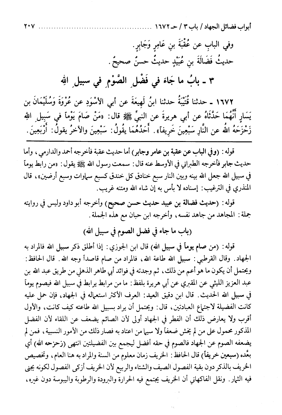 قال بن دَقِيقِ الْعِيدِ الْعُرْفُ الْأَكْثَرُ اسْتِعْمَالُهُ فِي الْجِهَادِ فإنحمل كَانَتِ الْفَضِيلَةُ لِاجْتِمَاعِ الْعِبَادَتَيْنِ قَالَ وَيُحْتَمَلُ أَنْ يُرَادَ بِسَبِيلِ اللَّهِ طَاعَتُهُ كَيْفَ كَانَتْ وَالْأَوَّلُ أَقْرَبُ وَلَا يُعَارِضُ ذَلِكَ أَنَّ الْفِطْرَ فِي الْجِهَادِ أَوْلَى لِأَنَّ الصَّائِمَ يَضْعُفُ عَنِ اللِّقَاءِ لِأَنَّ الْفَضْلَ الْمَذْكُورَ مَحْمُولٌ عَلَى مَنْ لَمْ يَخْشَ ضَعْفًا وَلَا سِيَّمَا مَنِ اعْتَادَ بِهِ فَصَارَ ذَلِكَ مِنَ الْأُمُورِ النِّسْبِيَّةِ فَمَنْ لَمْ يُضْعِفْهُ الصَّوْمُ عَنِ الْجِهَادِ فَالصَّوْمُ فِي حَقِّهِ أَفْضَلُ لِيَجْمَعَ بَيْنَ الْفَضِيلَتَيْنِ انْتَهَى (زَحْزَحَهُ اللَّهُ) أَيْ بَعَّدَهُ (سَبْعِينَ خَرِيفًا) قَالَ الْحَافِظُ الْخَرِيفُ زَمَانٌ مَعْلُومٌ مِنَ السَّنَةِ وَالْمُرَادُ بِهِ هُنَا الْعَامُ وَتَخْصِيصُ الْخَرِيفِ بِالذِّكْرِ دُونَ بَقِيَّةِ الْفُصُولِ الصَّيْفِ وَالشِّتَاءِ وَالرَّبِيعِ لِأَنَّ الْخَرِيفَ أَزْكَى الْفُصُولِ لِكَوْنِهِ يُجْنَى فِيهِ الثِّمَارُ