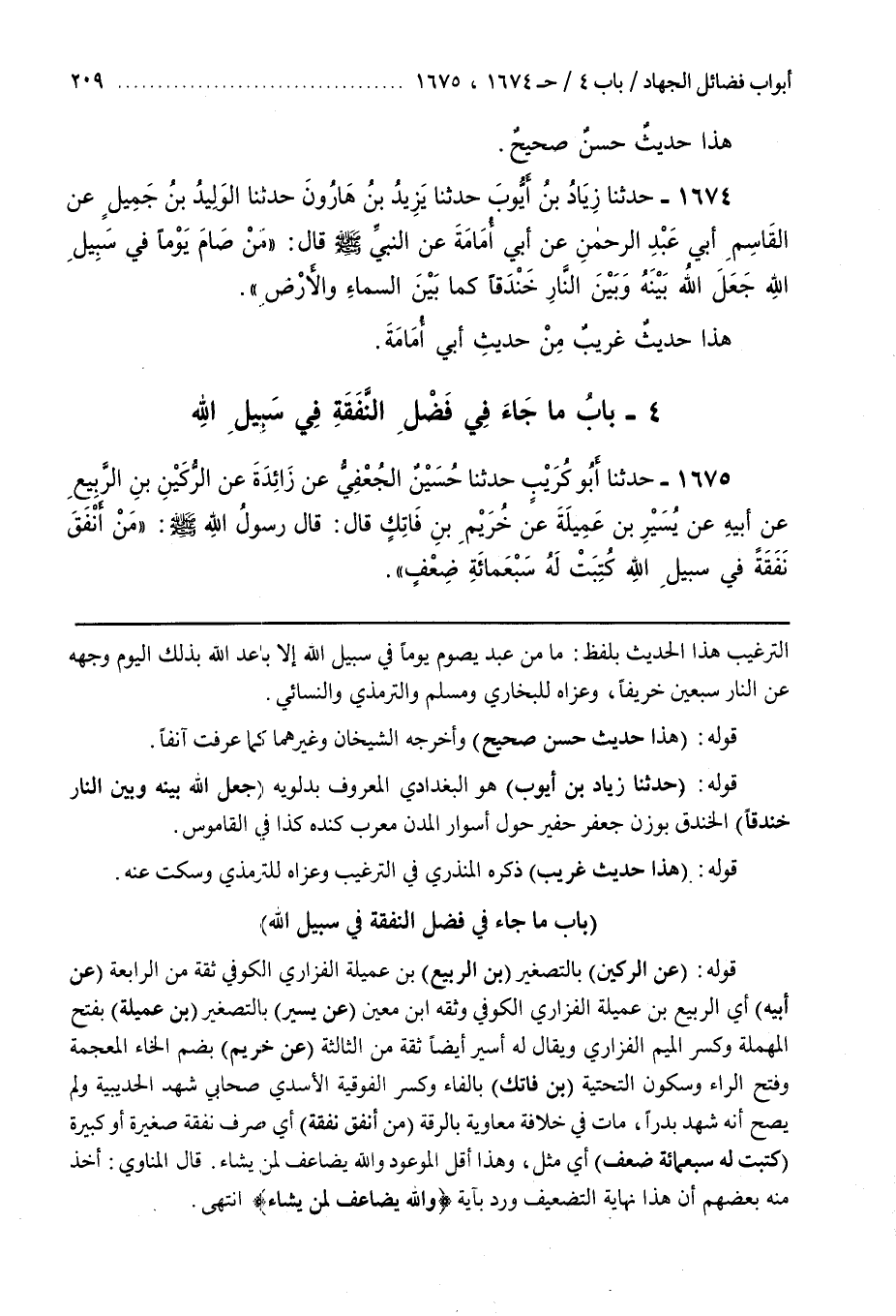[1625] قَوْلُهُ (عَنِ الرُّكَيْنِ) بِالتَّصْغِيرِ (بْنِ الرَّبِيعِ) بْنِ عَمِيلَةَ الْفَزَارِيِّ الْكُوفِيِّ ثِقَةٌ مِنَ الرَّابِعَةِ (عَنْ أَبِيهِ) أَيِ الرَّبِيعِ بْنِ عَمِيلَةَ الفزاري الكوفي وثقه بن مَعِينٍ (عَنْ يُسَيْرِ) بِالتَّصْغِيرِ (بْنِ عَمِيلَةَ) بِفَتْحِ الْمُهْمَلَةِ وَكَسْرِ الْمِيمِ الْفَزَارِيِّ وَيُقَالُ لَهُ أُسَيْرٌ أَيْضًا ثِقَةٌ مِنَ الثَّالِثَةِ (عَنْ خُرَيْمِ) بِضَمِّ الْخَاءِ الْمُعْجَمَةِ وَفَتْحِ الرَّاءِ وَسُكُونِ التَّحْتِيَّةِ (بْنِ فَاتِكٍ) بِالْفَاءِ وَكَسْرِ الْفَوْقِيَّةِ الْأَسَدِيِّ صَحَابِيٌّ شَهِدَ الْحُدَيْبِيَةَ وَلَمْ يَصِحَّ أَنَّهُ شَهِدَ بَدْرًا مَاتَ فِي خِلَافَةِ مُعَاوِيَةَ بِالرَّقَّةِ (مَنْ أَنْفَقَ نَفَقَةً) أَيْ صَرَفَ نَفَقَةً صَغِيرَةً أَوْ كَبِيرَةً (كُتِبَتْ له سبعمائة ضِعْفٍ) أَيْ مِثْلٍ وَهَذَا أَقَلُّ الْمَوْعُودِ وَاللَّهُ يُضَاعِفُ لِمَنْ يَشَاءُ