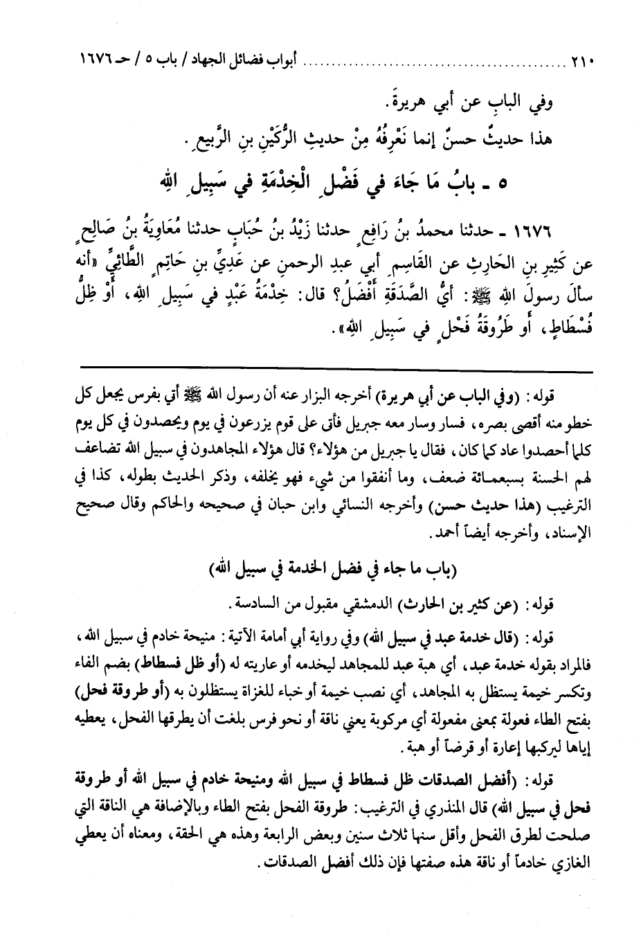 قَوْلُهُ (قَالَ خِدْمَةُ عَبْدٍ فِي سَبِيلِ اللَّهِ) وَفِي رِوَايَةِ أَبِي أُمَامَةَ الْآتِيَةِ مَنِيحَةُ خَادِمٍ فِي سَبِيلِ اللَّهِ فَالْمُرَادُ بِقَوْلِهِ خِدْمَةُ عَبْدٍ أَيْ هِبَةُ عَبْدٍ لِلْمُجَاهِدِ لِيَخْدُمَهُ أَوْ عَارِيَّتُهُ لَهُ (أَوْ ظِلُّ فُسْطَاطٍ) بِضَمِّ الْفَاءِ وَتُكْسَرُ خَيْمَةٌ يَسْتَظِلُّ بِهِ الْمُجَاهِدُ أَيْ نَصْبُ خَيْمَةٍ أَوْ خِبَاءٍ لِلْغُزَاةِ يَسْتَظِلُّونَ بِهِ (أَوْ طَرُوقَةُ فَحْلٍ) بِفَتْحِ الطَّاءِ فَعُولَةٌ بِمَعْنَى مَفْعُولَةٍ أَيْ مَرْكُوبَةٌ يَعْنِي نَاقَةً أَوْ نَحْوَ فَرَسٍ بَلَغَتْ أَنْ يَطْرُقَهَا الْفَحْلُ يُعْطِيهِ إِيَّاهَا لِيَرْكَبَهَا إِعَارَةً أَوْ قَرْضًا أَوْ هِبَةً