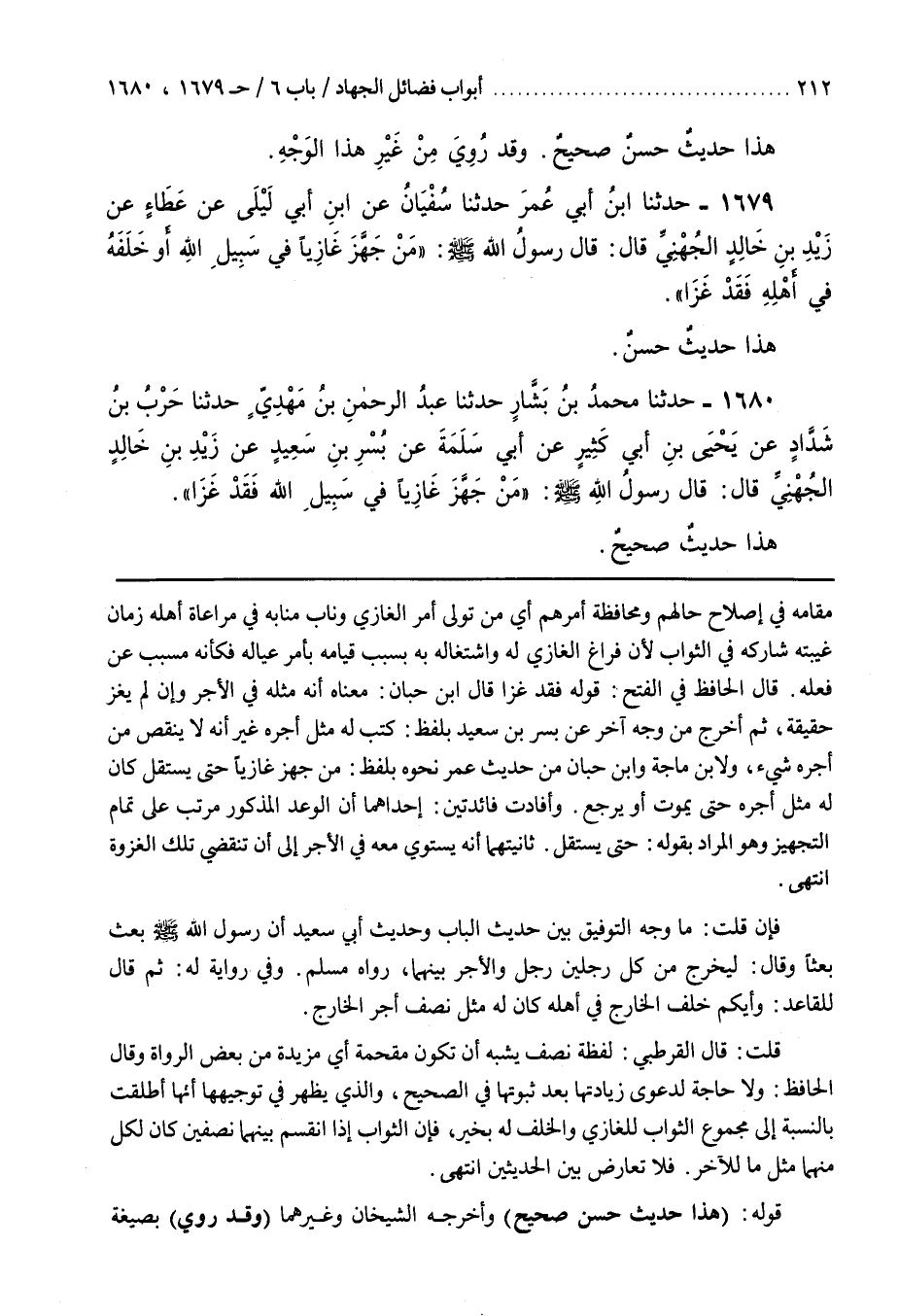 وَفِي رِوَايَةٍ لَهُ ثُمَّ قَالَ لِلْقَاعِدِ وَأَيُّكُمْ خَلَفَ الْخَارِجَ فِي أَهْلِهِ كَانَ لَهُ مِثْلُ نِصْفِ أَجْرِ الْخَارِجِ