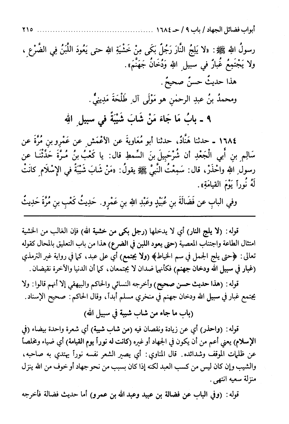 [1634] قَوْلُهُ (وَاحْذَرْ) أَيْ عَنْ زِيَادَةٍ وَنُقْصَانٍ فِيهِ (مَنْ شَابَ شَيْبَةً) أَيْ شَعْرَةً وَاحِدَةً بَيْضَاءَ (فِي الْإِسْلَامِ) يَعْنِي أَعَمَّ مِنْ أَنْ يَكُونَ فِي الْجِهَادِ أَوْ غَيْرِهِ (كَانَتْ لَهُ نُورًا يَوْمَ الْقِيَامَةِ) أَيْ ضِيَاءً وَمُخَلِّصًا عَنْ ظُلُمَاتِ الْمَوْقِفِ وَشَدَائِدِهِ