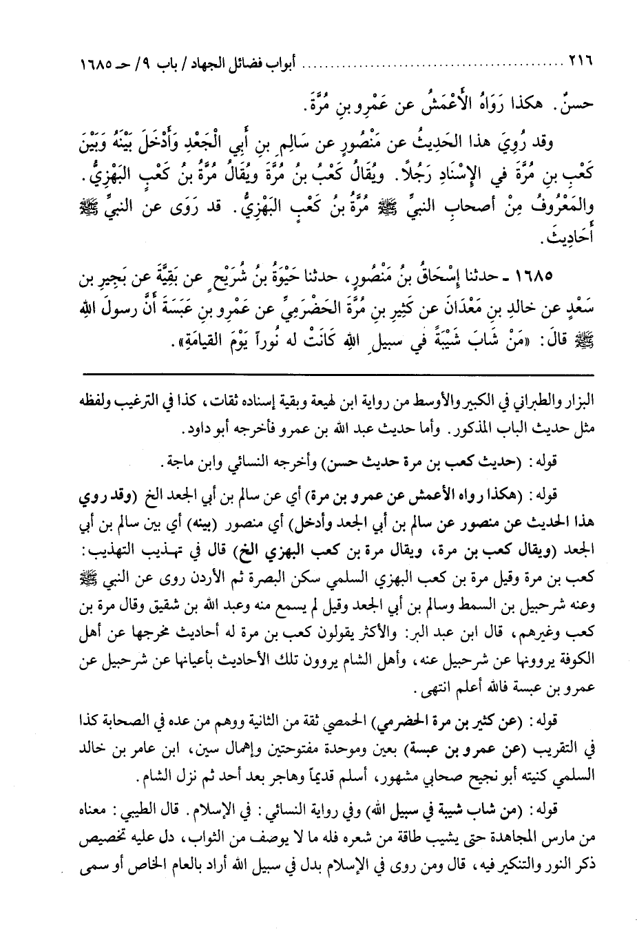 قَوْلُهُ (هَكَذَا رَوَاهُ الْأَعْمَشُ عَنْ عَمْرِو بْنِ مُرَّةَ) أَيْ عَنْ سَالِمِ بْنِ أَبِي الْجَعْدِ إِلَخْ (وَقَدْ رُوِيَ هَذَا الْحَدِيثُ عَنْ مَنْصُورٍ عَنْ سَالِمِ بْنِ أَبِي الْجَعْدِ وَأَدْخَلَ) أَيْ مَنْصُورٌ بَيْنَهُ أَيْ بَيْنَ سَالِمِ بْنِ أَبِي الْجَعْدِ (وَيُقَالُ كَعْبَ بْنَ مُرَّةَ وَيُقَالُ مُرَّةَ بْنَ كَعْبٍ الْبَهْزِيَّ إِلَخْ) قَالَ فِي تَهْذِيبِ التَّهْذِيبِ كَعْبُ بْنُ مُرَّةَ وَقِيلَ مُرَّةُ بْنُ كَعْبٍ الْبَهْزِيُّ السُّلَمِيُ سَكَنَ الْبَصْرَةَ ثُمَّ الْأُرْدُنَّ رَوَى عَنِ النَّبِيِّ صَلَّى اللَّهُ عَلَيْهِ وَسَلَّمَ وَعَنْهُ شُرَحْبِيلُ بْنُ السِّمْطِ وَسَالِمُ بْنُ أَبِي الْجَعْدِ وَقِيلَ لَمْ يَسْمَعْ مِنْهُ وَعَبْدُ اللَّهِ بْنُ شَقِيقٍ وَقَالَ مُرَّةُ بْنُ كَعْبٍ وغيرهم قال بن عَبْدِ الْبَرِّ وَالْأَكْثَرُ يَقُولُونَ كَعْبُ بْنُ مُرَّةَ لَهُ أَحَادِيثُ مُخَرِّجُهَا عَنْ أَهْلِ الْكُوفَةِ يَرْوُونَهَا عَنْ شُرَحْبِيلَ عَنْهُ وَأَهْلُ الشَّامِ يَرْوُونَ تِلْكَ الْأَحَادِيثَ بِأَعْيَانِهَا عَنْ شُرَحْبِيلَ عَنْ عَمْرِو بْنِ عبسة فالله أَعْلَمُ انْتَهَى