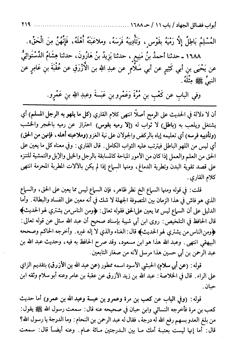 أن لَا دَلَالَةَ فِي الْحَدِيثِ عَلَى الرُّمْحِ أَصْلًا انتهى كلام القارىء (كُلُّ مَا يَلْهُو بِهِ الرَّجُلُ الْمُسْلِمُ) أَيْ يَشْتَغِلُ وَيَلْعَبُ بِهِ (بَاطِلٌ) لَا ثَوَابَ لَهُ (إِلَّا رَمْيَهُ بِقَوْسٍ) احْتِرَافٌ عَنْ رَمْيِهِ بِالْحَجَرِ وَالْخَشَبِ (وَتَأْدِيبَهُ فَرَسَهُ) أَيْ تَعْلِيمَهُ إِيَّاهُ بِالرَّكْضِ وَالْجَوَلَانِ عَلَى نِيَّةِ الْغَزْوِ (وَمُلَاعَبَتَهُ أَهْلَهُ فَإِنَّهُنَّ مِنَ الْحَقِّ) أَيْ لَيْسَ مِنَ اللَّهْوِ الْبَاطِلِ فيترتب عليه الثواب الكامل