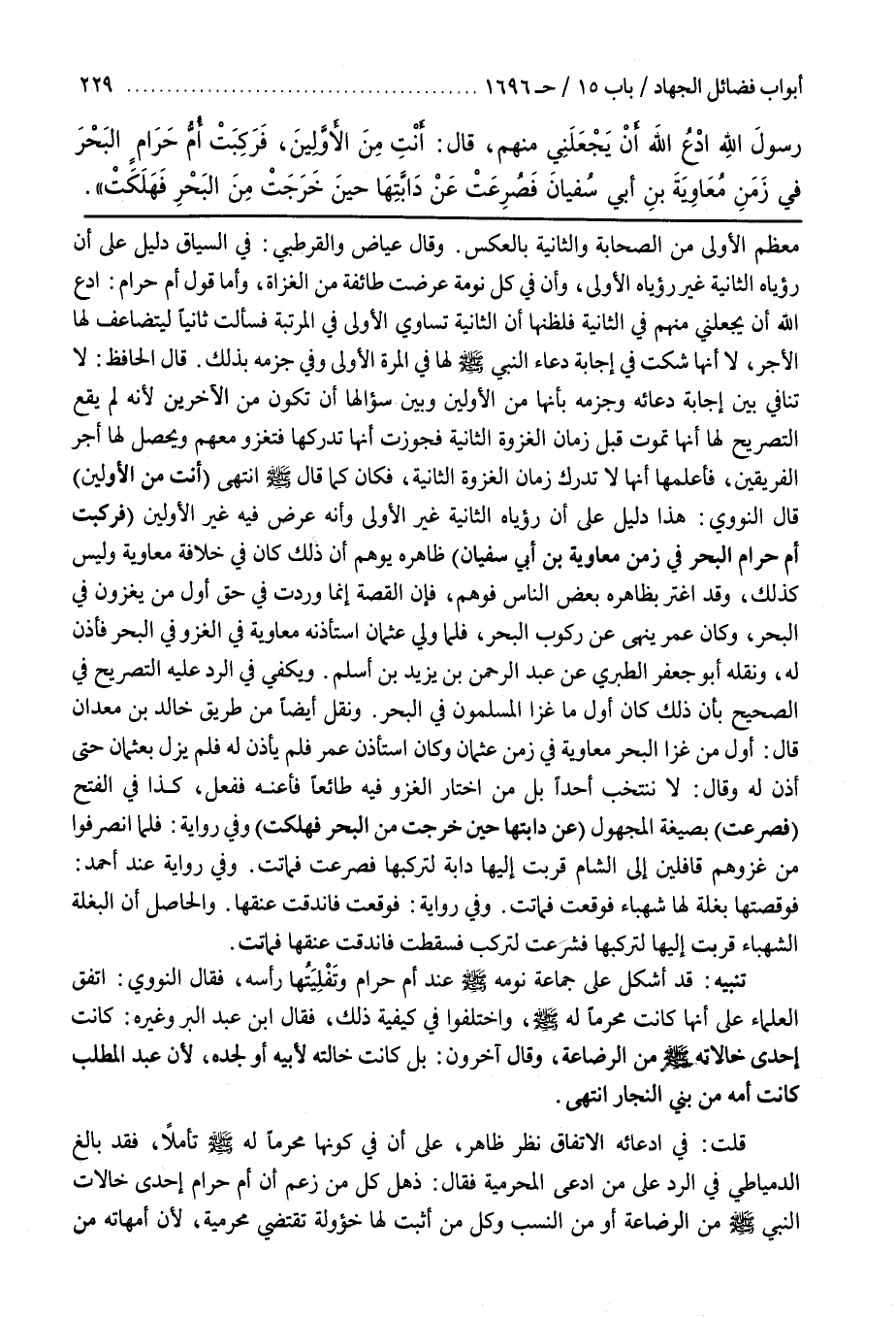 تَنْبِيهٌ قَدْ أَشْكَلَ عَلَى جَمَاعَةٍ نَوْمُهُ صَلَّى اللَّهُ عَلَيْهِ وَسَلَّمَ عِنْدَ أُمِّ حَرَامٍ وَتَفْلِيَتُهَا رَأْسَهُ فَقَالَ النَّوَوِيُّ اتَّفَقَ الْعُلَمَاءُ عَلَى أَنَّهَا كَانَتْ مَحْرَمًا لَهُ صَلَّى اللَّهُ عَلَيْهِ وَسَلَّمَ وَاخْتَلَفُوا في كيفية ذلك فقال بن عَبْدِ الْبَرِّ وَغَيْرُهُ كَانَتْ إِحْدَى خَالَاتِهِ صَلَّى اللَّهُ عَلَيْهِ وَسَلَّمَ مِنَ الرَّضَاعَةِ وَقَالَ آخَرُونَ بَلْ كَانَتْ خَالَةً لِأَبِيهِ أَوْ لِجَدِّهِ لِأَنَّ عَبْدَ الْمُطَّلِبِ كَانَتْ أُمُّهُ مِنْ بَنِي النَّجَّارِ انْتَهَى
