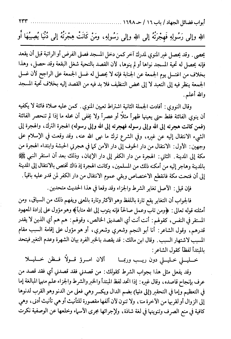 كَمَنْ عَلَيْهِ صَلَاةٌ فَائِتَةٌ لَا يَكْفِيهِ أَنْ يَنْوِيَ الْفَائِتَةَ فَقَطْ حَتَّى يُعَيِّنَهَا ظُهْرًا مَثَلًا أَوْ عَصْرًا وَلَا يَخْفَى أَنَّ مَحَلَّهُ مَا إِذَا لَمْ تَنْحَصِرِ الْفَائِتَةُ (فَمَنْ كَانَتْ هِجْرَتُهُ إِلَى اللَّهِ وَإِلَى رَسُولِهِ فَهِجْرَتُهُ إِلَى اللَّهِ وَإِلَى رَسُولِهِ) الْهِجْرَةُ التَّرْكُ وَالْهِجْرَةُ إِلَى الشَّيْءِ الِانْتِقَالُ إِلَيْهِ عَنْ غَيْرِهِ وَفِي الشَّرْعِ تَرْكُ مَا نَهَى اللَّهُ عَنْهُ وَقَدْ وَقَعَتْ فِي الْإِسْلَامِ عَلَى وَجْهَيْنِ الْأَوَّلُ الِانْتِقَالُ مِنْ دَارِ الْخَوْفِ إِلَى دَارِ الْأَمْنِ كَمَا فِي هِجْرَتَيِ الْحَبَشَةِ وَابْتِدَاءِ الْهِجْرَةِ مِنْ مَكَّةَ إِلَى الْمَدِينَةِ