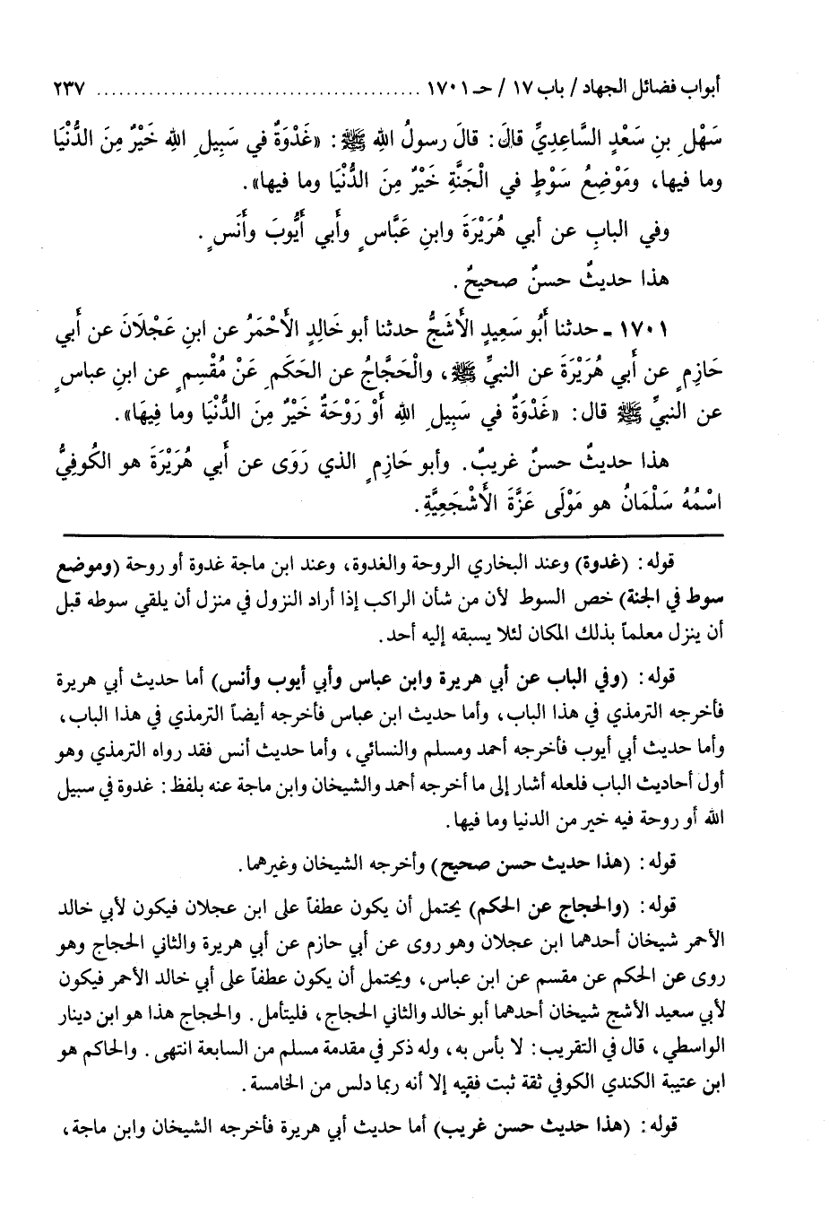 قَوْلُهُ (وَفِي الْبَابِ عَنْ أَبِي هُرَيْرَةَ وبن عَبَّاسٍ وَأَبِي أَيُّوبَ وَأَنَسٍ) أَمَّا حَدِيثُ أَبِي هُرَيْرَةَ فَأَخْرَجَهُ التِّرْمِذِيُّ فِي هَذَا الْبَابِ وَأَمَّا حديث بن عَبَّاسٍ فَأَخْرَجَهُ أَيْضًا التِّرْمِذِيُّ فِي هَذَا الْبَابِ وأَمَّا حَدِيثُ أَبِي أَيُّوبَ فَأَخْرَجَهُ أَحْمَدُ وَمُسْلِمٌ وَالنَّسَائِيُّ وَأَمَّا حَدِيثُ أَنَسٍ فَقَدْ رَوَاهُ التِّرْمِذِيُّ وَهُوَ أَوَّلُ أَحَادِيثِ الْبَابِ فَلَعَلَّهُ أَشَارَ إِلَى ما أخرجه أحمد والشيخان وبن مَاجَهْ عَنْهُ بِلَفْظِ غَدْوَةٌ فِي سَبِيلِ اللَّهِ أَوْ رَوْحَةٌ فِيهِ خَيْرٌ مِنَ الدُّنْيَا وَمَا فِيهَا