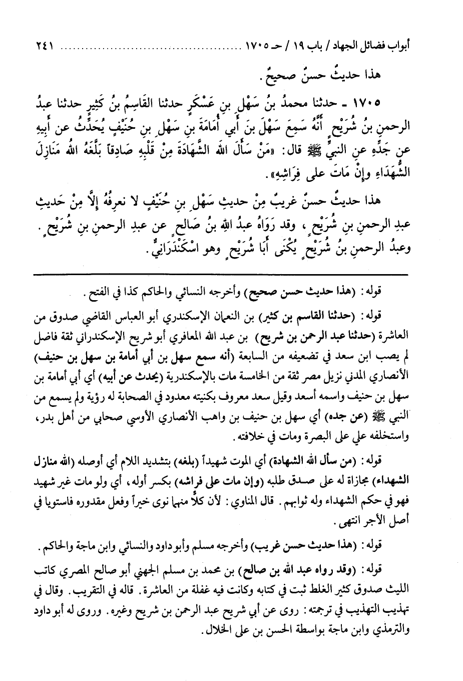 [1653] قَوْلُهُ (حَدَّثَنَا الْقَاسِمُ بْنُ كَثِيرِ) بْنُ النُّعْمَانِ الْإِسْكَنْدَرِيُّ أَبُو الْعَبَّاسِ الْقَاضِي صَدُوقٌ مِنَ الْعَاشِرَةِ (حَدَّثَنَا عَبْدُ الرَّحْمَنِ بْنُ شُرَيْحٍ) بْنُ عَبْدِ اللَّهِ الْمَعَافِرِيُّ أَبُو شُرَيْحٍ الْإسْكَنْدَرَانِيُّ ثِقَةٌ فَاضِلٌ لم يصب بن سَعْدٍ فِي تَضْعِيفِهِ مِنَ السَّابِعَةِ (أَنَّهُ سَمِعَ سَهْلَ بْنَ أَبِي أُمَامَةَ بْنِ سَهْلِ بْنِ حنيف) الأناصري الْمَدَنِيَّ نَزِيلَ مِصْرَ ثِقَةٌ مِنَ الْخَامِسَةِ مَاتَ بِالْإِسْكَنْدَرِيَّةِ (يُحَدِّثُ عَنْ أَبِيهِ) أَيْ أَبِي أُمَامَةَ بْنِ سَهْلِ بْنِ حُنَيْفٍ وَاسْمُهُ أَسْعَدُ وَقِيلَ سَعْدٌ مَعْرُوفٌ بِكُنْيَتِهِ مَعْدُودٌ فِي الصَّحَابَةِ لَهُ رُؤْيَةٌ وَلَمْ يَسْمَعْ مِنَ النَّبِيِّ صَلَّى اللَّهُ عَلَيْهِ وَسَلَّمَ (عَنْ جَدِّهِ) أَيْ سَهْلِ بْنِ حُنَيْفِ بْنِ وَاهِبٍ الْأَنْصَارِيِّ الْأَوْسِيِّ صَحَابِيٌّ مِنْ أَهْلِ بَدْرٍ وَاسْتَخْلَفَهُ عَلِيٌّ عَلَى الْبَصْرَةِ وَمَاتَ فِي خِلَافَتِهِ