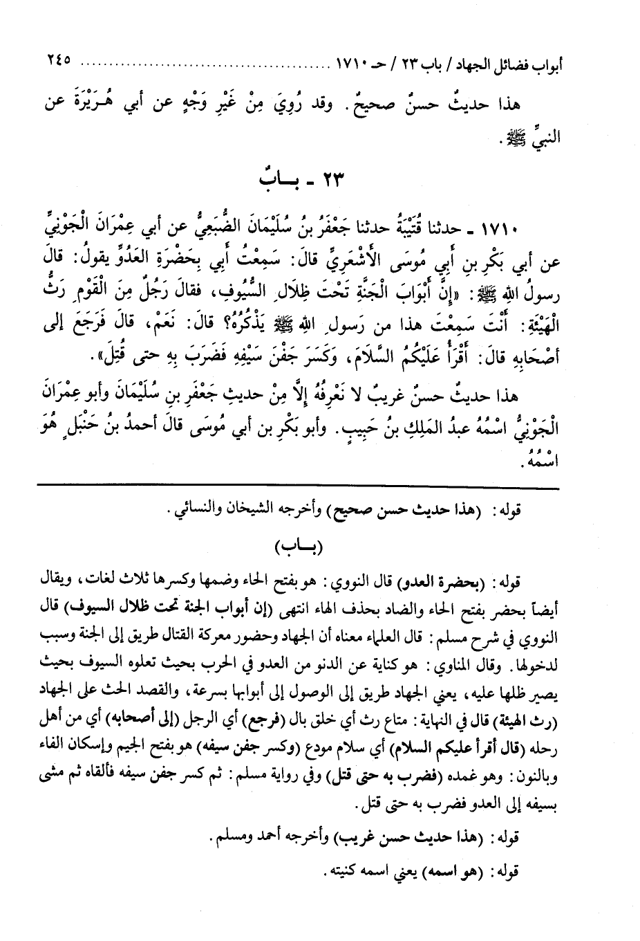 [1659] قَوْلُهُ (بِحَضْرَةِ الْعَدُوِّ) قَالَ النَّوَوِيُّ هُوَ بِفَتْحِ الْحَاءِ وَضَمِّهَا وَكَسْرِهَا ثَلَاثُ لغات ويقال أيضا بحضر الفتح الْحَاءِ وَالضَّادِ بِحَذْفِ الْهَاءِ انْتَهَى (أَنَّ أَبْوَابَ الْجَنَّةِ تَحْتَ ظِلَالِ السُّيُوفِ) قَالَ النَّوَوِيُّ فِي شَرْحِ مُسْلِمٍ قَالَ الْعُلَمَاءُ مَعْنَاهُ أَنَّ الْجِهَادَ وَحُضُورَ مَعْرَكَةِ الْقِتَالِ طَرِيقٌ إِلَى الْجَنَّةِ وَسَبَبٌ لِدُخُولِهَا