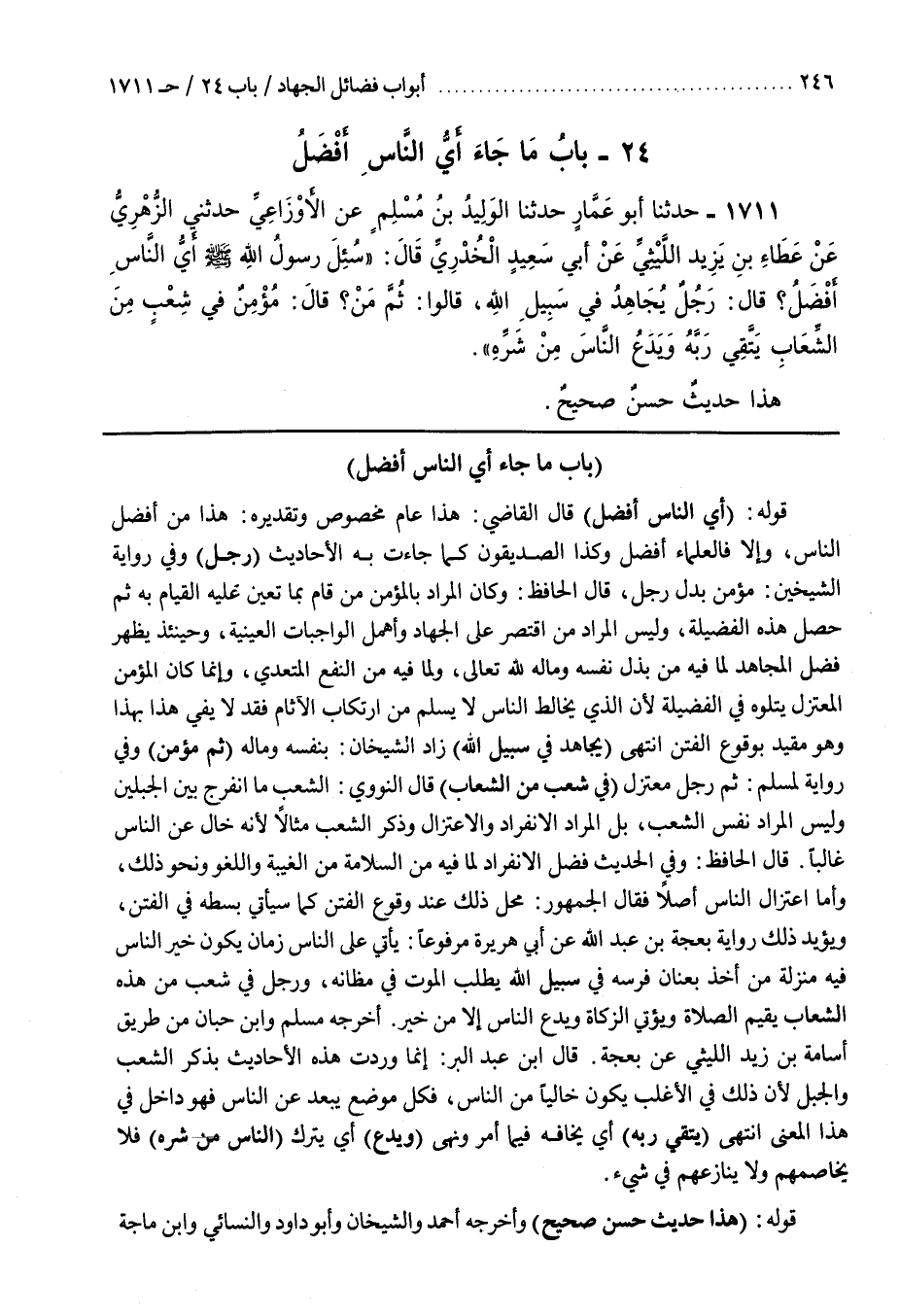 [1660] قَوْلُهُ (أَيُّ النَّاسِ أَفْضَلُ) قَالَ الْقَاضِي هَذَا عَامٌّ مَخْصُوصٌ وَتَقْدِيرُهُ هَذَا مِنْ أَفْضَلِ النَّاسِ وَإِلَّا فَالْعُلَمَاءُ أَفْضَلُ وَكَذَا الصِّدِّيقُونَ كَمَا جَاءَتْ بِهِ الْأَحَادِيثُ (رَجُلٌ) وَفِي رِوَايَةِ الشَّيْخَيْنِ مُؤْمِنٌ بَدَلَ رَجُلٍ قَالَ الْحَافِظُ وَكَانَ الْمُرَادُ بِالْمُؤْمِنِ مَنْ قَامَ بِمَا تَعَيَّنَ عَلَيْهِ الْقِيَامُ بِهِ ثُمَّ حَصَّلَ هَذِهِ الْفَضِيلَةَ وَلَيْسَ الْمُرَادُ مَنِ اقْتَصَرَ عَلَى الْجِهَادِ وَأَهْمَلَ الْوَاجِبَاتِ الْعَيْنِيَّةَ وَحِينَئِذٍ يَظْهَرُ فضل المجاهدات لِمَا فِيهِ مِنْ بَذْلِ نَفْسِهِ وَمَالِهِ لِلَّهِ تَعَالَى وَلِمَا فِيهِ مِنَ النَّفْعِ الْمُتَعَدِّي وَإِنَّمَا كَانَ الْمُؤْمِنُ الْمُعْتَزِلُ يَتْلُوهُ فِي الْفَضِيلَةِ لِأَنَّ الَّذِي يُخَالِطُ النَّاسَ لَا يَسْلَمُ مِنَ ارْتِكَابِ الْآثَامِ فَقَدْ لَا يَفِي هَذَا بِهَذَا وَهُوَ مُقَيَّدٌ بِوُقُوعِ الْفِتَنِ انْتَهَى (يُجَاهِدُ فِي سَبِيلِ اللَّهِ) زَادَ الشَّيْخَانِ بِنَفْسِهِ وَمَالِهِ (ثُمَّ مُؤْمِنٌ) وَفِي رِوَايَةٍ لِمُسْلِمٍ ثُمَّ رَجُلٌ مُعْتَزِلٌ (فِي شعب من الشعاب) قال النووي الشعب ما انفرج بين الجبلين وليس المراد نفس الشعب بل المراد الانفراد والاعتزال وذكر الشِّعْبُ مِثَالًا لِأَنَّهُ خَالٍ عَنِ النَّاسِ غَالِبًا