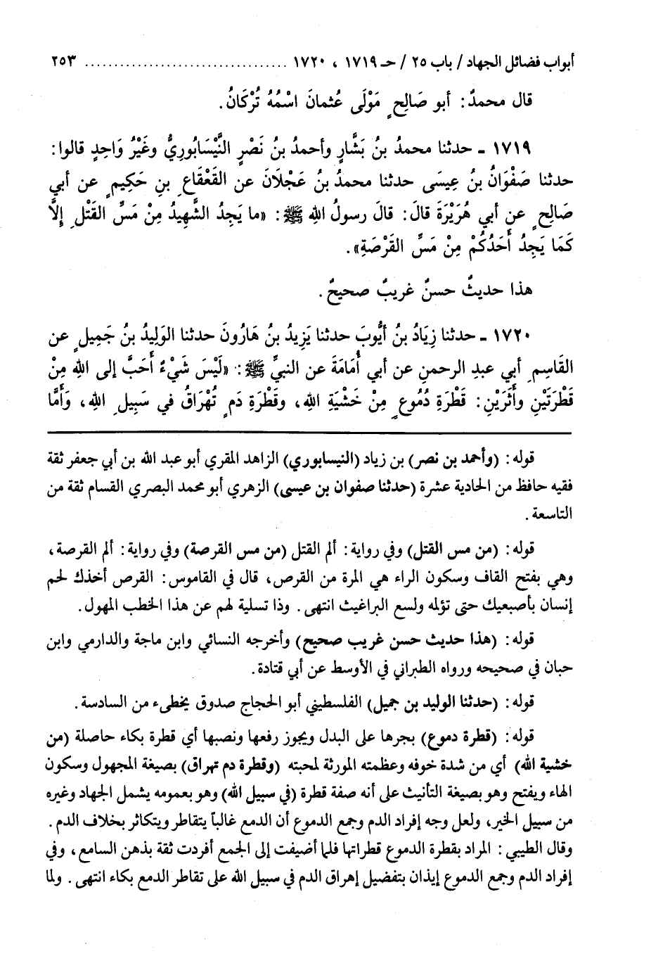 قَوْلُهُ (قَطْرَةِ دُمُوعٍ) بِجَرِّهَا عَلَى الْبَدَلِ وَيَجُوزُ رَفْعُهَا وَنَصْبُهَا أَيْ قَطْرَةُ بُكَاءٍ حَاصِلَةٌ (مِنْ خَشْيَةِ اللَّهِ) أَيْ مِنْ شِدَّةِ خَوْفِهِ وَعَظَمَتِهِ الْمُورِثَةِ لِمَحَبَّتِهِ (قَطْرَةُ دَمٍ تُهْرَاقُ) بِصِيغَةِ الْمَجْهُولِ وَسُكُونِ الْهَاءِ وَيُفْتَحُ وَهُوَ بِصِيغَةِ التَّأْنِيثِ عَلَى أَنَّهُ صِفَةُ قَطْرَةٍ (فِي سَبِيلِ اللَّهِ) وَهُوَ بِعُمُومِهِ يَشْمَلُ الْجِهَادَ وَغَيْرَهُ مِنْ سَبِيلِ الْخَيْرِ وَلَعَلَّ وَجْهَ إِفْرَادِ الدَّمِ وَجَمْعِ الدُّمُوعِ أَنَّ الدَّمْعَ غَالِبًا يَتَقَاطَرُ وَيَتَكَاثَرُ بِخِلَافِ الدَّمِ