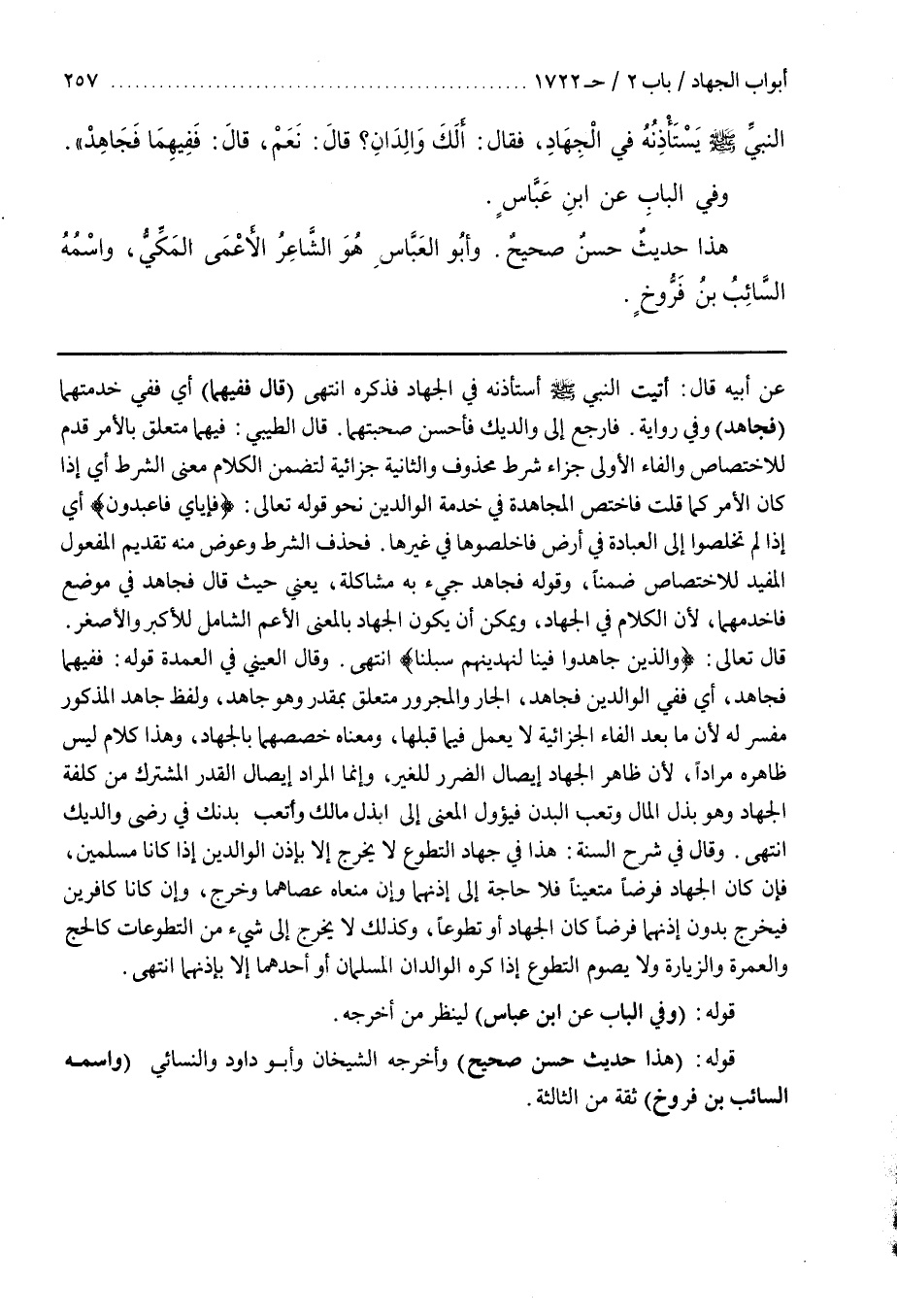 وَقَالَ الْعَيْنِيُّ فِي الْعُمْدَةِ قَوْلُهُ فَفِيهِمَا فَجَاهِدْ أَيْ فَفِي الْوَالِدَيْنِ فَجَاهِدْ الْجَارُّ وَالْمَجْرُورُ مُتَعَلِّقٌ بِمُقَدَّرٍ وَهُوَ جَاهِدْ وَلَفْظُ جَاهِدِ الْمَذْكُورُ مُفَسِّرٌ لَهُ لِأَنَّ مَا بَعْدَ الْفَاءِ الْجَزَائِيَّةِ لَا يَعْمَلُ فِيمَا قَبْلَهَا وَمَعْنَاهُ خَصِّصْهُمَا بِالْجِهَادِ وَهَذَا كَلَامٌ لَيْسَ ظَاهِرُهُ مُرَادًا لِأَنَّ ظَاهِرَ الْجِهَادِ إِيصَالُ الضَّرَرِ لِلْغَيْرِ وَإِنَّمَا الْمُرَادُ إِيصَالُ الْقَدْرِ الْمُشْتَرَكِ مِنْ كُلْفَةِ الْجِهَادِ وَهُوَ بَذْلُ المال وتعب البدن فيؤول الْمَعْنَى إِلَى ابْذُلْ مَالَكَ وَأَتْعِبْ بَدَنَكَ فِي رضى وَالِدَيْكَ انْتَهَى