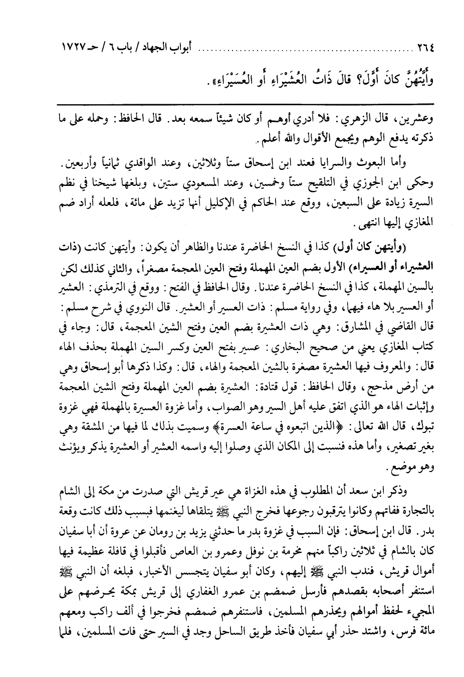 (وَأَيَّتُهُنَّ كَانَ أَوَّلُ) كَذَا فِي النُّسَخِ الْحَاضِرَةِ عِنْدَنَا وَالظَّاهِرُ أَنْ يَكُونَ وَأَيَّتُهُنَّ كَانَتْ (ذَاتُ الْعُشَيْرَاءِ أَوِ الْعُسَيْرَاءِ) الْأَوَّلُ بِضَمِّ الْعَيْنِ الْمُهْمَلَةِ وَفَتْحِ الشِّينِ الْمُعْجَمَةِ مُصَغَّرًا وَالثَّانِي كَذَلِكَ لَكِنْ بِالسِّينِ الْمُهْمَلَةِ كَذَا فِي النُّسَخِ الْحَاضِرَةِ عِنْدَنَا