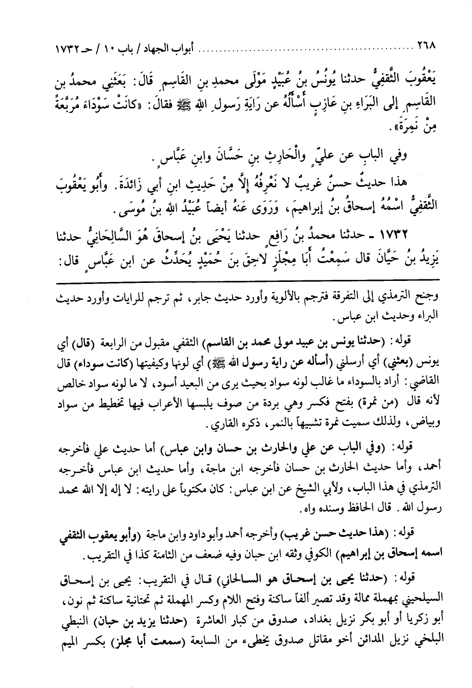 [1680] قَوْلُهُ (حَدَّثَنَا يُونُسُ بْنُ عُبَيْدٍ مَوْلَى مُحَمَّدِ بْنِ الْقَاسِمِ) الثَّقَفِيُّ مَقْبُولٌ مِنَ الرَّابِعَةِ (قَالَ) أَيْ يُونُسُ (بَعَثَنِي) أَيْ أَرْسَلَنِي (أَسْأَلُهُ عَنْ رَايَةِ رَسُولُ اللَّهِ صَلَّى اللَّهُ عَلَيْهِ وَسَلَّمَ) أَيْ لَوْنِهَا وَكَيْفِيَّتِهَا (كَانَتْ سَوْدَاءَ) قَالَ الْقَاضِي أَرَادَ بِالسَّوْدَاءِ مَا غَالِبُ لَوْنِهِ سَوَادٌ بِحَيْثُ يُرَى مِنَ الْبَعِيدِ أَسْوَدَ لَا مَا لَوْنُهُ سَوَادٌ خَالِصٌ لِأَنَّهُ قَالَ (مِنْ نَمِرَةٍ) بِفَتْحٍ فَكَسْرٍ وَهِيَ بُرْدَةٌ مِنْ صُوفٍ يَلْبَسُهَا الْأَعْرَابُ فِيهَا تَخْطِيطٌ مِنْ سَوَادٍ وَبَيَاضٍ وَلِذَلِكَ سميت نمرة تشبيها بالنمر ذكره القارىء