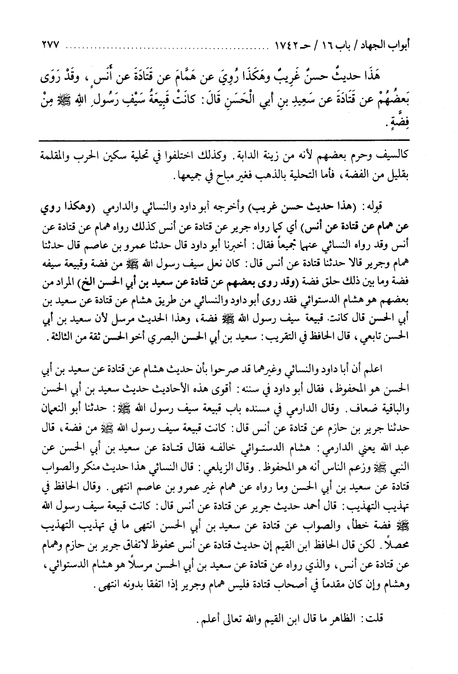 قَوْلُهُ (هَذَا حَدِيثٌ حَسَنٌ غَرِيبٌ) وَأَخْرَجَهُ أَبُو دَاوُدَ وَالنَّسَائِيُّ وَالدَّارِمِيُّ (وَهَكَذَا رُوِيَ عَنْ هَمَّامٍ عَنْ قَتَادَةَ عَنْ أَنَسٍ) أَيْ كَمَا رَوَاهُ جَرِيرٌ عَنْ قَتَادَةَ عَنْ أَنَسٍ كَذَلِكَ رَوَاهُ هَمَّامٌ عَنْ قَتَادَةَ عَنْ أَنَسٍ وَقَدْ رَوَاهُ النَّسَائِيُّ عَنْهُمَا جَمِيعًا فَقَالَ أَخْبَرَنَا أَبُو دَاوُدَ قَالَ حَدَّثَنَا عَمْرُو بْنُ عاصم قال حدثنا همام وجرير قال حَدَّثَنَا قَتَادَةُ عَنْ أَنَسٍ قَالَ كَانَ نَعْلُ سَيْفِ رَسُولِ اللَّهِ صَلَّى اللَّهُ عَلَيْهِ وَسَلَّمَ مِنْ فِضَّةٍ وَقَبِيعَةُ سَيْفِهِ فِضَّةً وَمَا بَيْنَ ذَلِكَ حِلَقُ فِضَّةٍ (وَقَدْ رَوَى بَعْضُهُمْ عَنْ قَتَادَةَ عَنْ سَعِيدِ بْنِ أَبِي الْحَسَنِ إِلَخْ) الْمُرَادُ مِنْ بَعْضِهِمْ هُوَ هِشَامٌ الدَّسْتُوَائِيُّ فَقَدْ رَوَى أَبُو دَاوُدَ وَالنَّسَائِيُّ مِنْ طَرِيقِ هِشَامٍ عَنْ قَتَادَةَ عَنْ سَعِيدِ بْنِ أَبِي الْحَسَنِ قَالَ كَانَتْ قَبِيعَةُ سَيْفِ رَسُولِ اللَّهِ صَلَّى اللَّهُ عَلَيْهِ وَسَلَّمَ فِضَّةً وَهَذَا الْحَدِيثُ مُرْسَلٌ لِأَنَّ سَعِيدَ بْنَ أَبِي الْحَسَنِ تَابِعِيٌّ قَالَ الْحَافِظُ فِي التَّقْرِيبِ سَعِيدُ بْنُ أَبِي الْحَسَنِ الْبَصْرِيُّ أَخُو الْحَسَنِ ثِقَةٌ مِنَ الثَّالِثَةِ