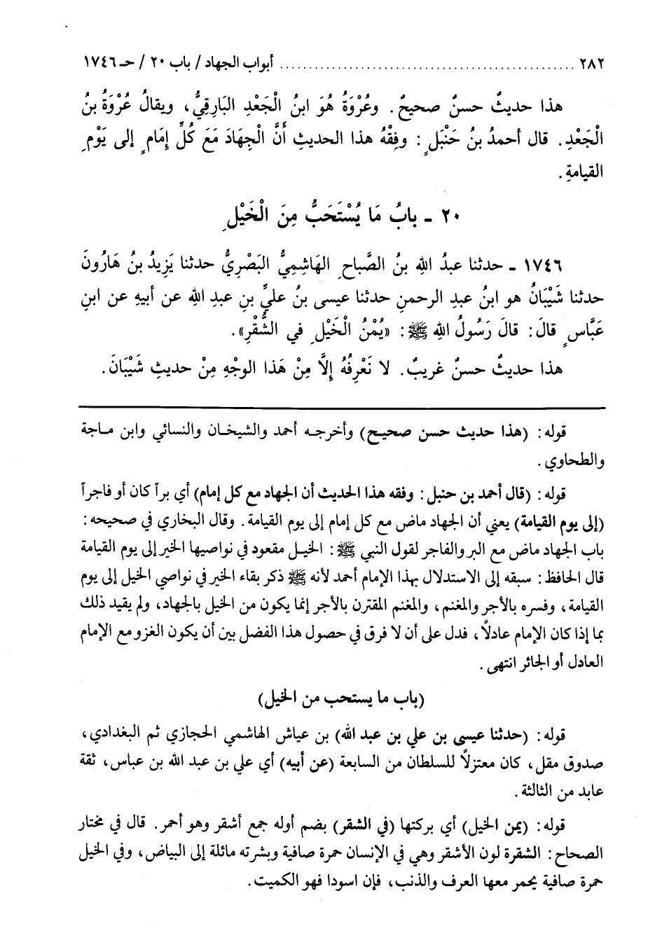 وَقَالَ الْبُخَارِيُّ فِي صَحِيحِهِ بَابُ الْجِهَادُ مَاضٍ مَعَ الْبَرِّ وَالْفَاجِرِ لِقَوْلِ النَّبِيِّ صَلَّى اللَّهُ عَلَيْهِ وَسَلَّمَ الْخَيْلُ مَعْقُودٌ فِي نَوَاصِيهَا الْخَيْرُ إِلَى يَوْمِ الْقِيَامَةِ قَالَ الْحَافِظُ سَبَقَهُ إِلَى الِاسْتِدْلَالِ بِهَذَا الْإِمَامُ أَحْمَدُ لِأَنَّهُ صَلَّى اللَّهُ عَلَيْهِ وَسَلَّمَ ذَكَرَ بَقَاءَ الْخَيْرِ فِي نَوَاصِي الْخَيْلِ إِلَى يَوْمِ الْقِيَامَةِ وَفَسَّرَهُ بِالْأَجْرِ وَالْمَغْنَمِ وَالْمَغْنَمُ الْمُقْتَرِنُ بِالْأَجْرِ إِنَّمَا يَكُونُ مِنَ الْخَيْلِ بِالْجِهَادِ وَلَمْ يُقَيَّدْ ذَلِكَ بِمَا إِذَا كَانَ الْإِمَامُ عَادِلًا فَدَلَّ عَلَى أَنْ لَا فَرْقَ فِي حُصُولِ هَذَا الْفَضْلِ بَيْنَ أَنْ يَكُونَ الْغَزْوُ مَعَ الامام العادل والجائر انتهى
