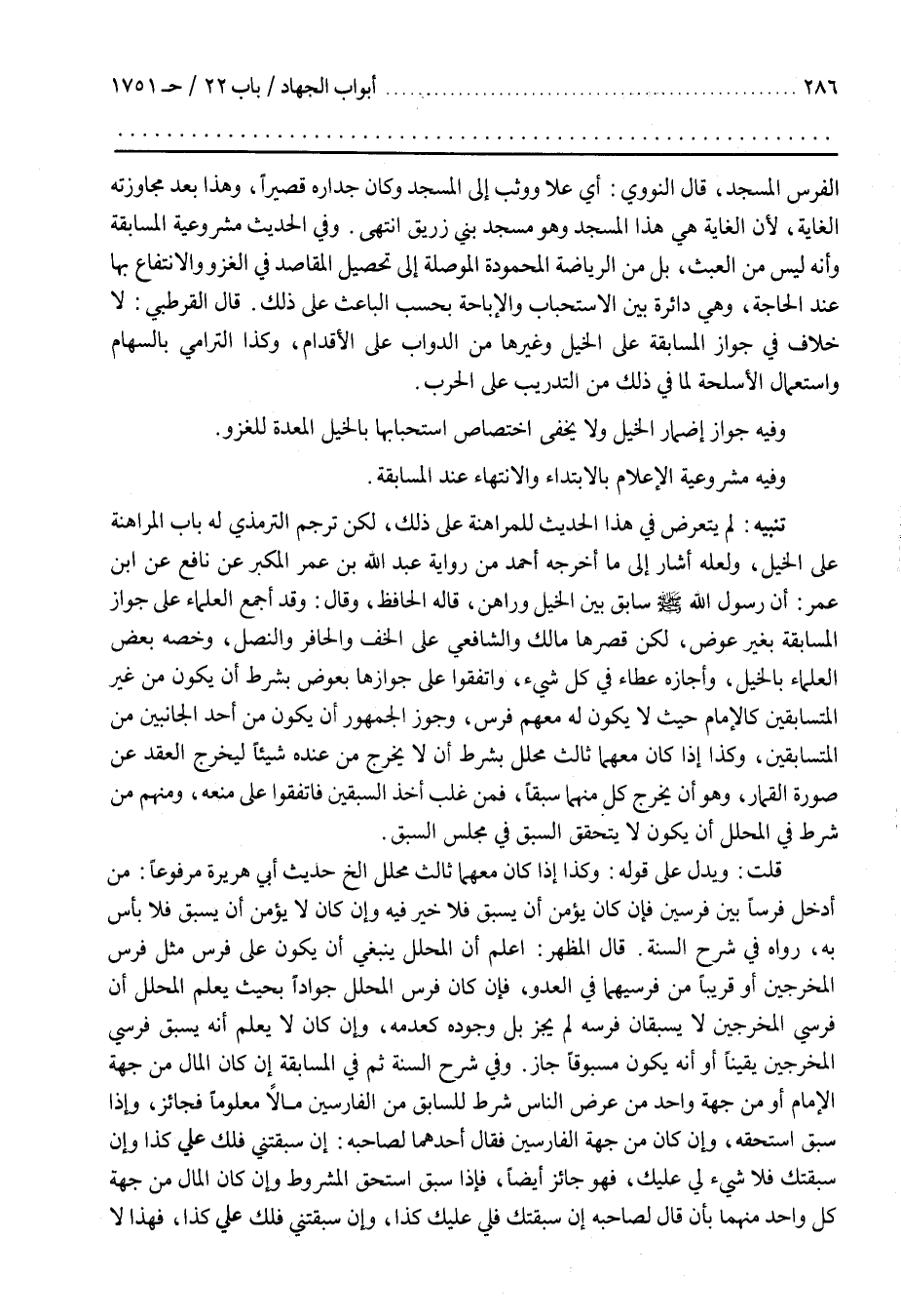 تَنْبِيهٌ لَمْ يَتَعَرَّضْ فِي هَذَا الْحَدِيثِ لِلْمُرَاهَنَةِ عَلَى ذَلِكَ لَكِنْ تَرْجَمَ التِّرْمِذِيُّ لَهُ بَابَ الْمُرَاهَنَةِ عَلَى الْخَيْلِ وَلَعَلَّهُ أَشَارَ إِلَى مَا أَخْرَجَهُ أَحْمَدُ مِنْ رِوَايَةِ عَبْدِ اللَّهِ بْنِ عُمَرَ الْمُكَبَّرِ عَنْ نَافِعٍ عن بن عُمَرَ أَنَّ رَسُولَ اللَّهِ صَلَّى اللَّهُ عَلَيْهِ وَسَلَّمَ سَابَقَ بَيْنَ الْخَيْلِ وَرَاهَنَ قَالَهُ الْحَافِظُ وَقَالَ وَقَدْ أَجْمَعَ الْعُلَمَاءُ عَلَى جَوَازِ الْمُسَابَقَةِ بِغَيْرِ عِوَضٍ لَكِنْ قَصَرَهَا مَالِكٌ وَالشَّافِعِيُّ عَلَى الْخُفِّ وَالْحَافِرِ وَالنَّصْلِ وَخَصَّهُ بَعْضُ الْعُلَمَاءِ بِالْخَيْلِ وَأَجَازَهُ عَطَاءٌ فِي كُلِّ شَيْءٍ وَاتَّفَقُوا عَلَى جَوَازِهَا بِعِوَضٍ بِشَرْطِ أَنْ يَكُونَ مِنْ غَيْرِ الْمُتَسَابِقِينَ كَالْإِمَامِ حَيْثُ لَا يَكُونُ لَهُ مَعَهُمْ فَرَسٌ وَجَوَّزَ الْجُمْهُورُ أَنْ يَكُونَ مِنْ أَحَدِ الْجَانِبَيْنِ مِنَ الْمُتَسَابِقِينَ وَكَذَا إِذَا كَانَ مَعَهُمَا ثَالِثٌ مُحَلَّلٌ بِشَرْطِ أَنْ لَا يُخْرِجَ مِنْ عِنْدِهِ شَيْئًا لِيُخْرِجَ الْعَقْدَ عَنْ صُورَةِ الْقِمَارِ وَهُوَ أَنْ يُخْرِجَ كُلٌّ مِنْهُمَا سَبَقًا فَمَنْ غَلَبَ أَخَذَ السَّبَقَيْنِ فَاتَّفَقُوا عَلَى مَنْعِهِ وَمِنْهُمْ مَنْ شَرَطَ فِي الْمُحَلَّلِ أَنْ يَكُونَ لَا يَتَحَقَّقُ السَّبَقُ فِي مَجْلِسِ السَّبَقِ